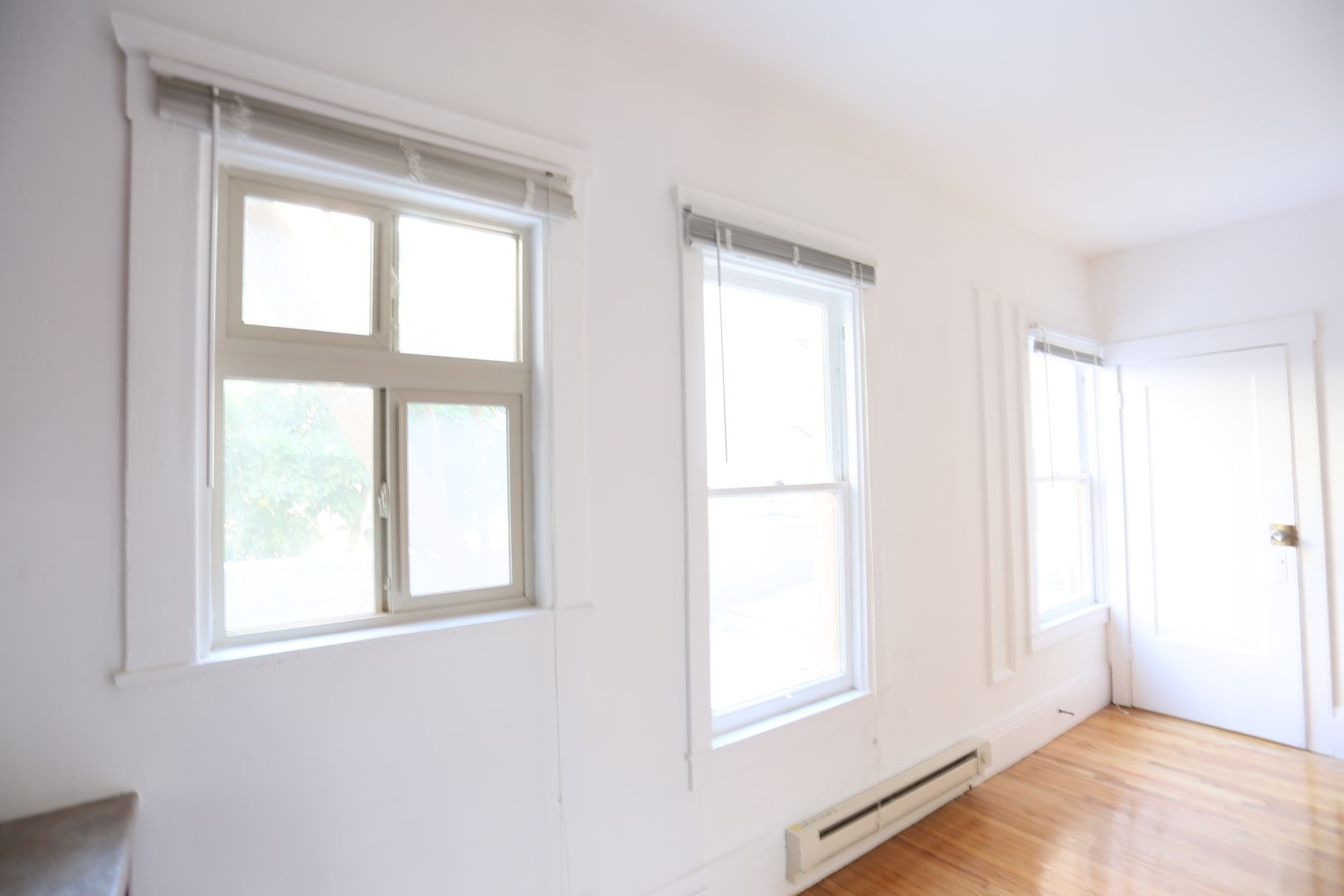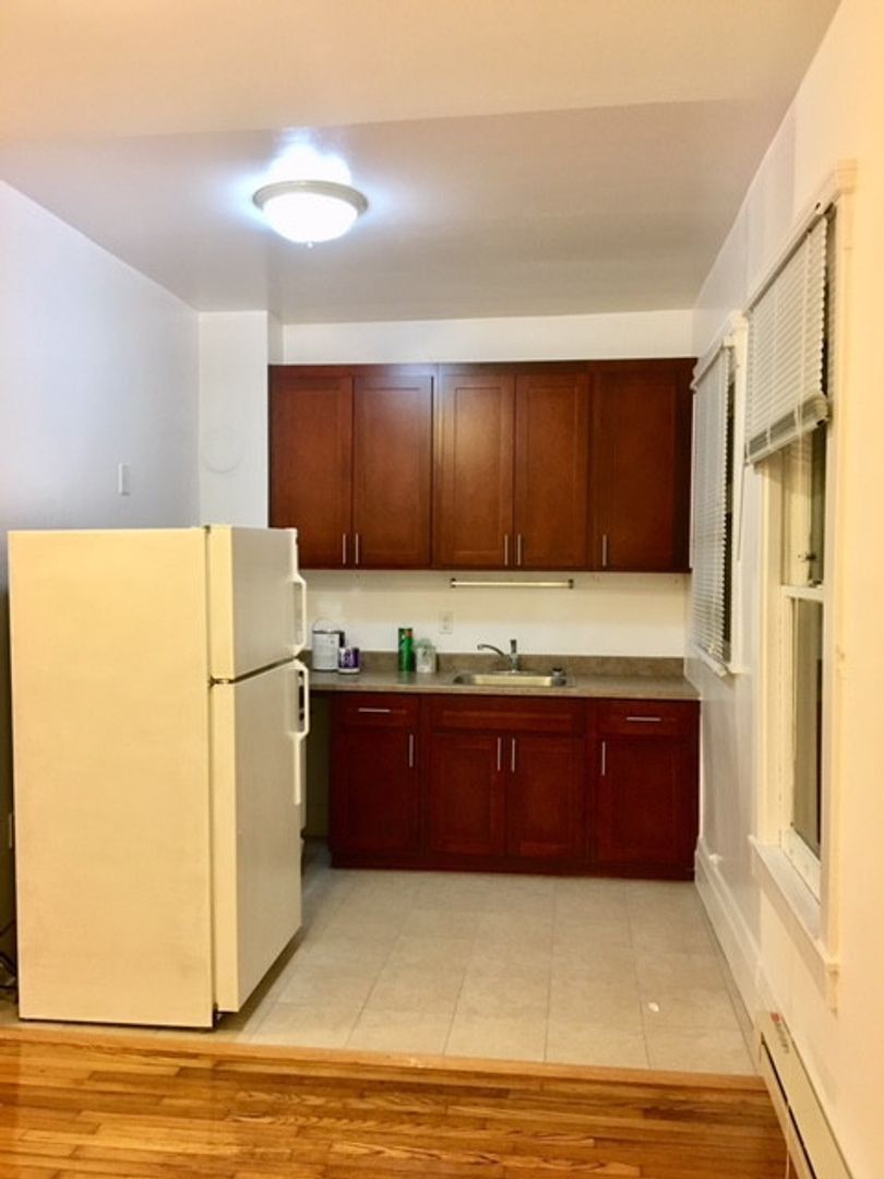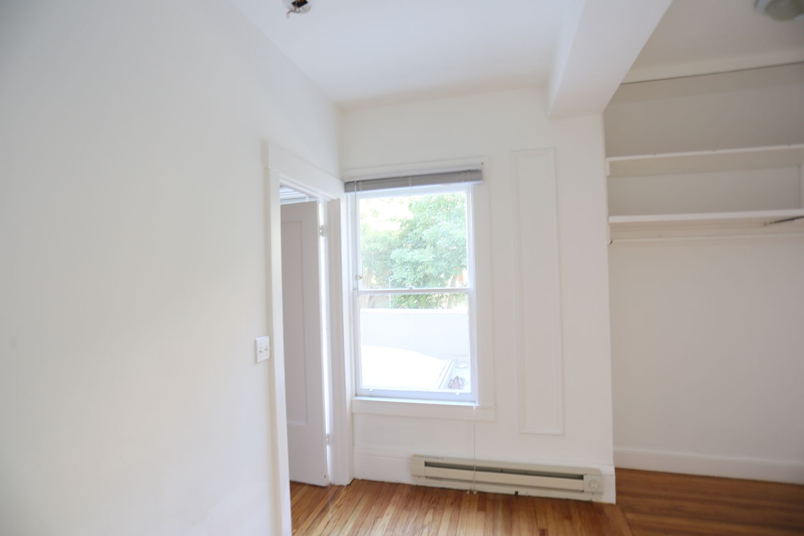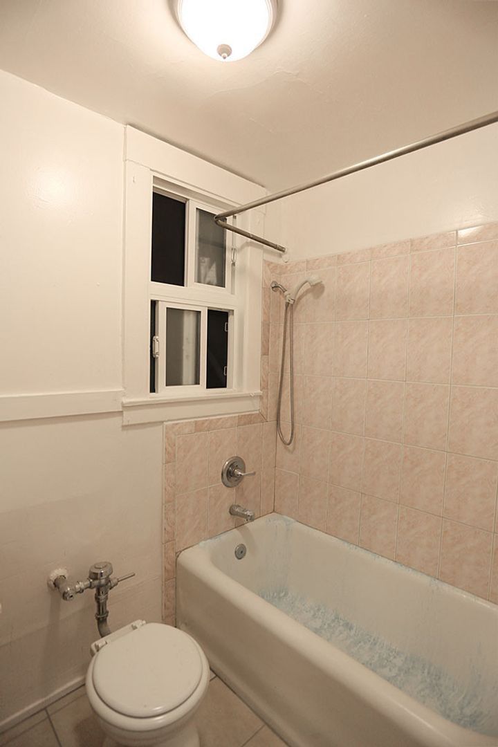 Second floor 1BR/1BA downtown apartment on Bush and Hyde. The unit includes polished floors throughout the living spaces except the kitchen and bathroom. Living room has three windows with blinds. The kitchen is outset from the living room in a corner, and includes a gas stove. Bedroom has an open closet in an alcove. The bathroom includes a standard tub with overhead shower.