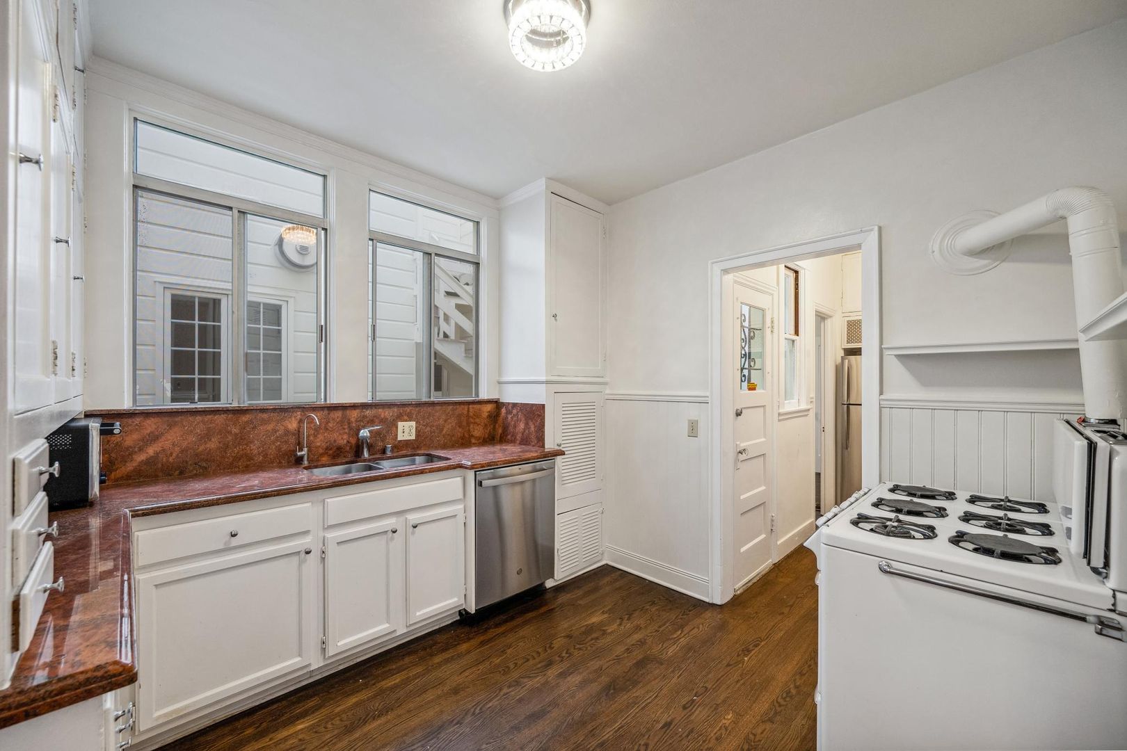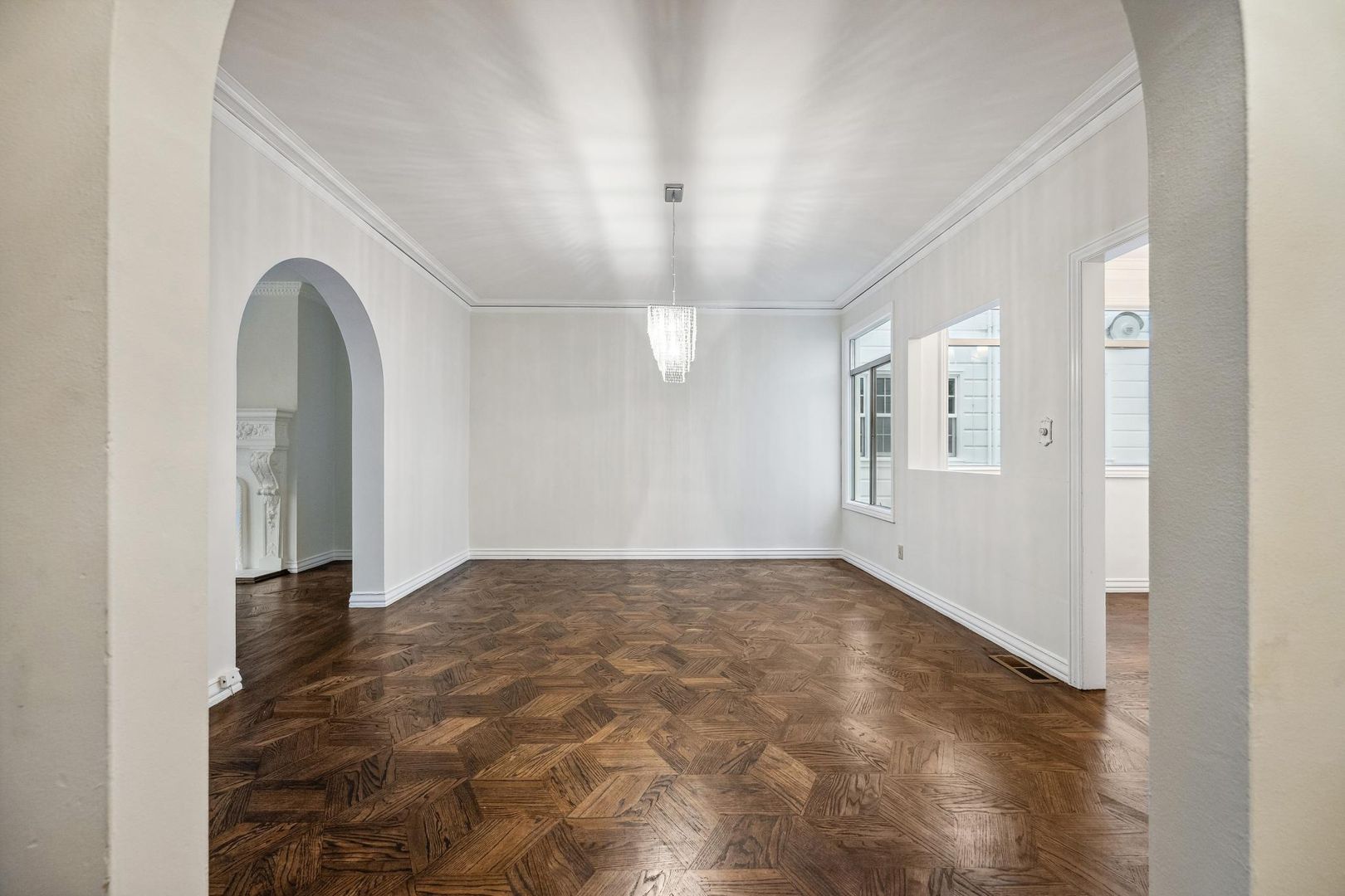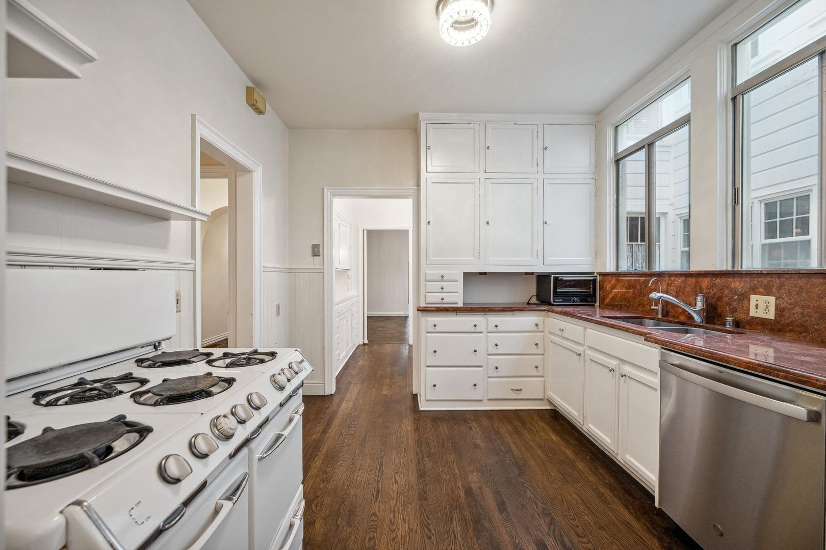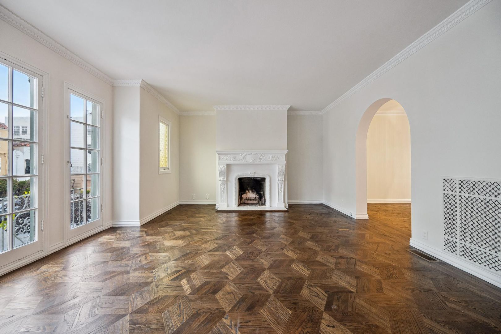 Top, second floor 4BR/2BA full flat in the Marina. Floors are hardwood except in kitchen and baths. Huge living room has arched windows facing the street and a decorative fireplace. The formal dining room is behind it and connects to the breakfast room. Breakfast room has a lot of cabinets, drawers and a counter. It is partially open and provides access to the kitchen on one side. Kitchen includes gas stove and dishwasher. A narrow room at the back of the kitchen has the refrigerator and side-by-side washer and dryer. It also has a good number of cabinets. All four bedrooms are at the back of the flat. They range in size from very large to small. The master bedroom is huge and connects to the master bath. Master bath is long and narrow. It is paneled in dark wood and has a Jacuzzi with shower at one end. The second bedroom is normal-sized and is accessed via the master bedroom. It is adjacent to the large, third bedroom. The fourth, small bedroom is next to the third bedroom. There is a linen closet just outside of it. Shared bath has shower-over-tub.