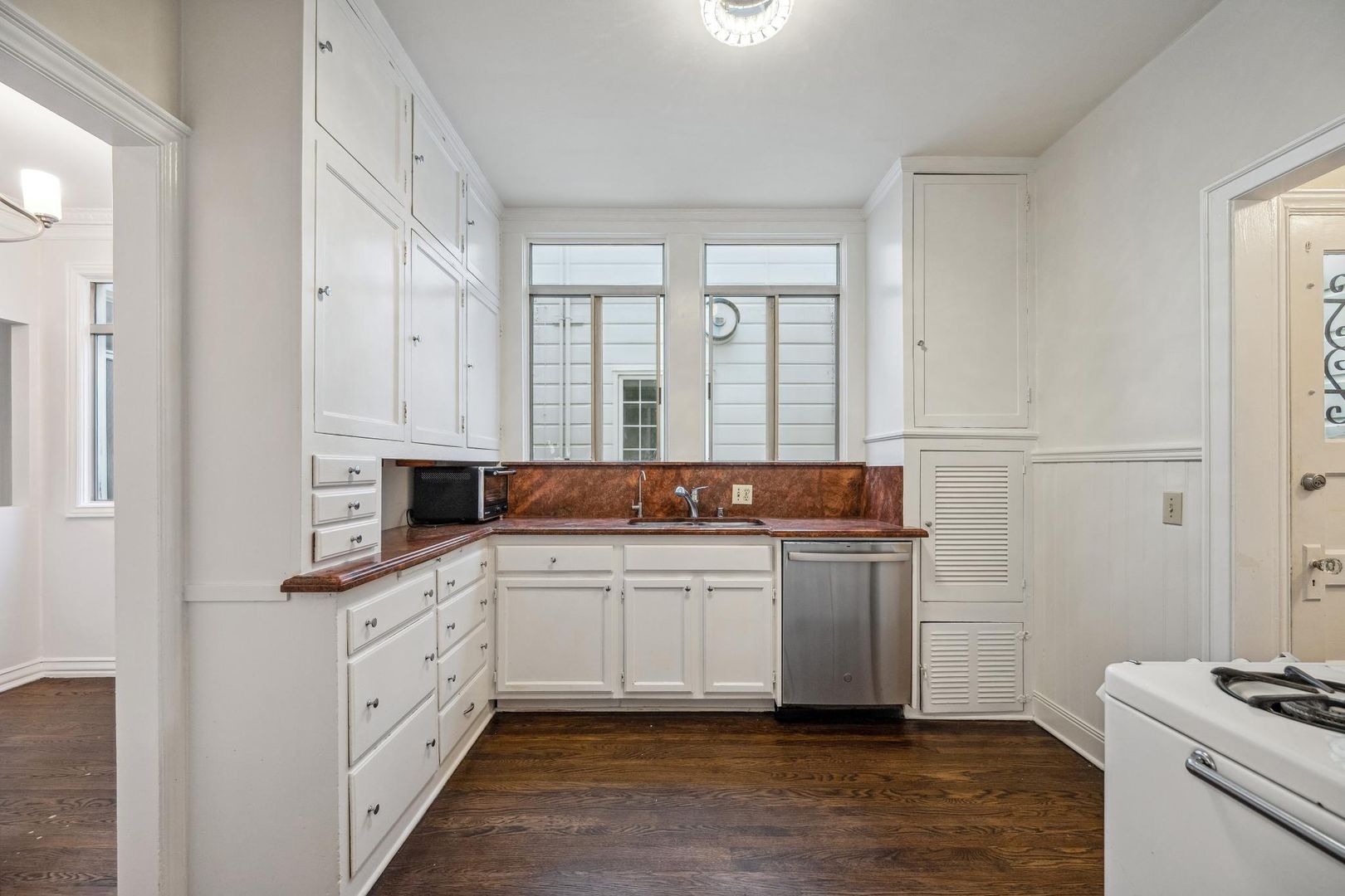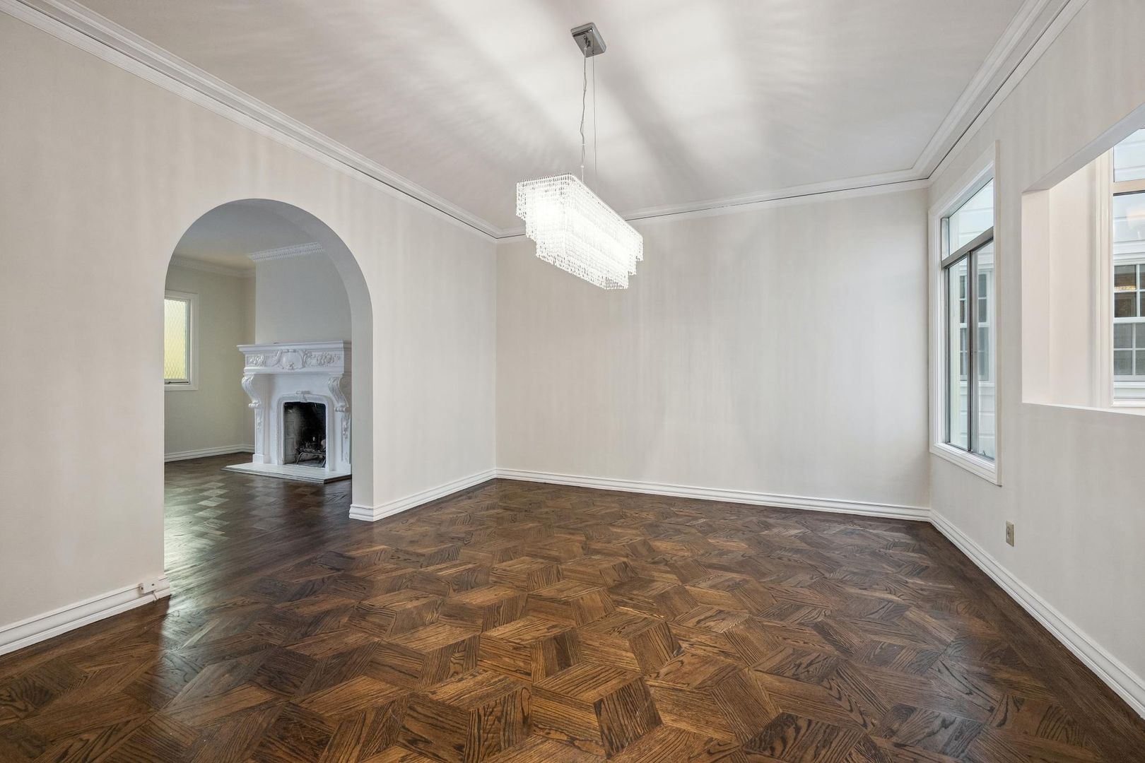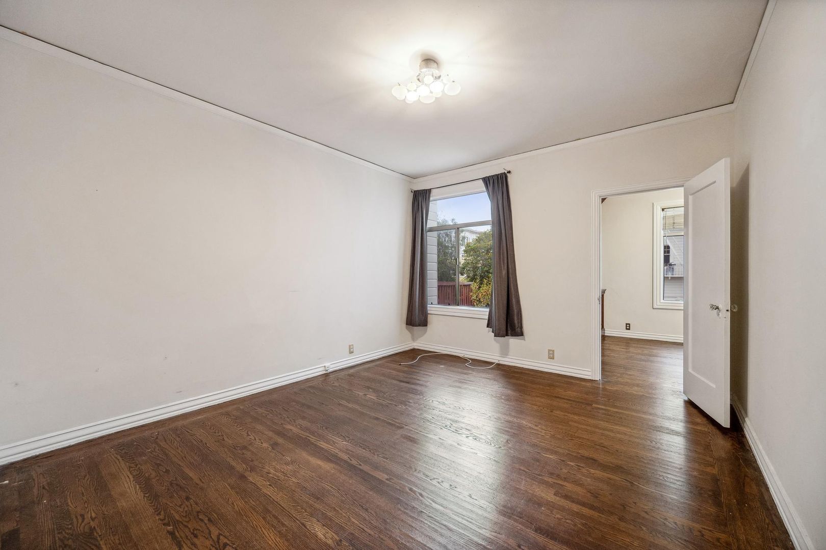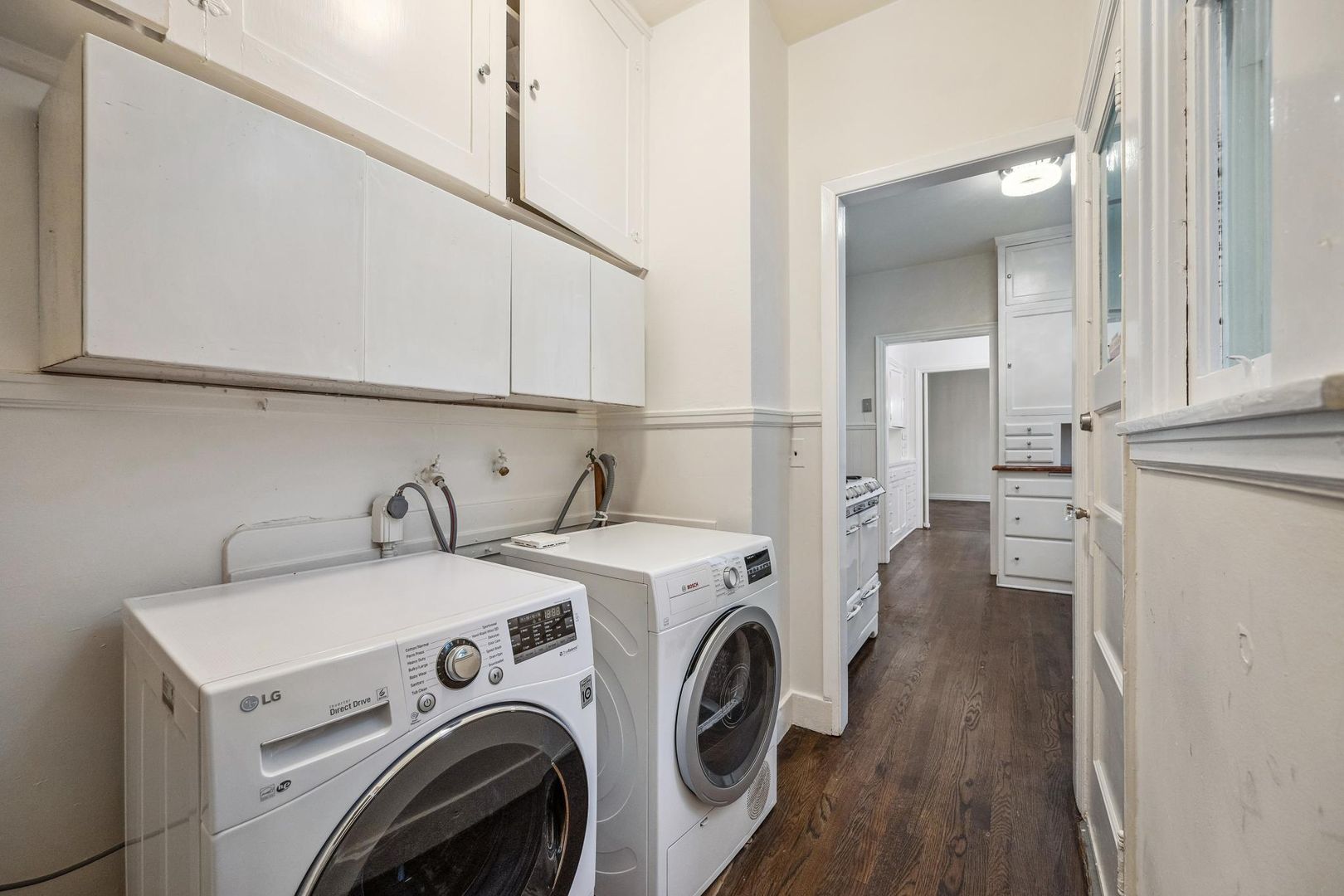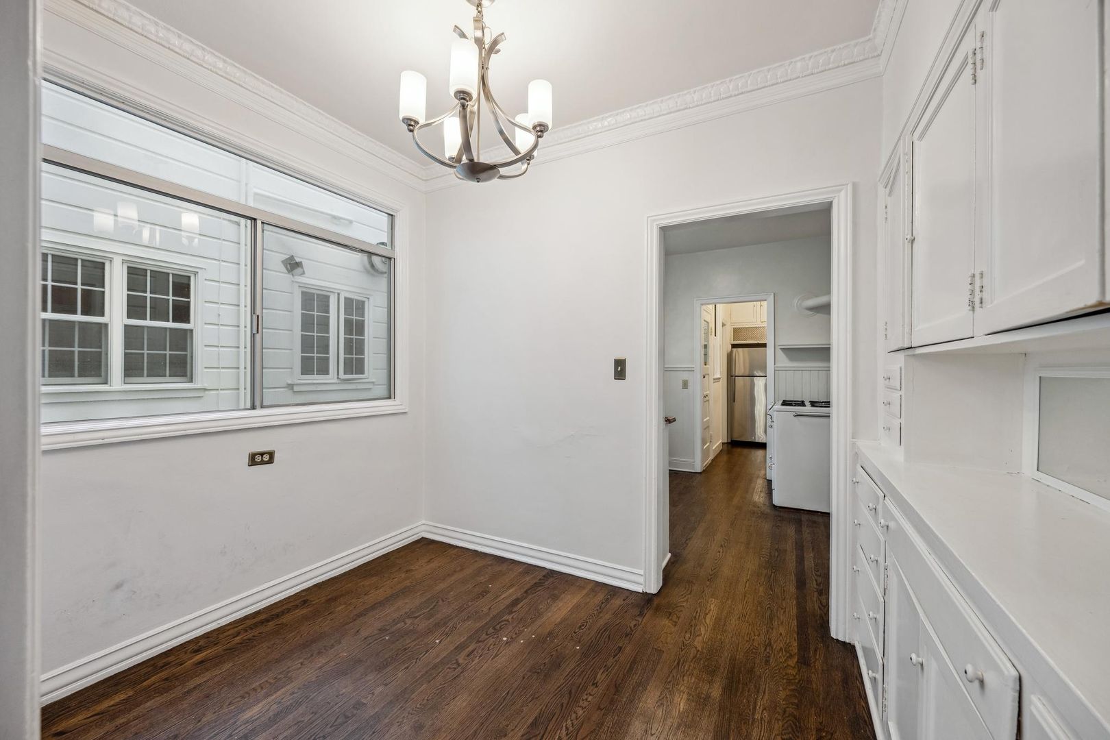 Top, second floor 4BR/2BA full flat in the Marina. Floors are hardwood except in kitchen and baths. Huge living room has arched windows facing the street and a decorative fireplace. The formal dining room is behind it and connects to the breakfast room. Breakfast room has a lot of cabinets, drawers and a counter. It is partially open and provides access to the kitchen on one side. Kitchen includes gas stove and dishwasher. A narrow room at the back of the kitchen has the refrigerator and side-by-side washer and dryer. It also has a good number of cabinets. All four bedrooms are at the back of the flat. They range in size from very large to small. The master bedroom is huge and connects to the master bath. Master bath is long and narrow. It is paneled in dark wood and has a Jacuzzi with shower at one end. The second bedroom is normal-sized and is accessed via the master bedroom. It is adjacent to the large, third bedroom. The fourth, small bedroom is next to the third bedroom. There is a linen closet just outside of it. Shared bath has shower-over-tub.