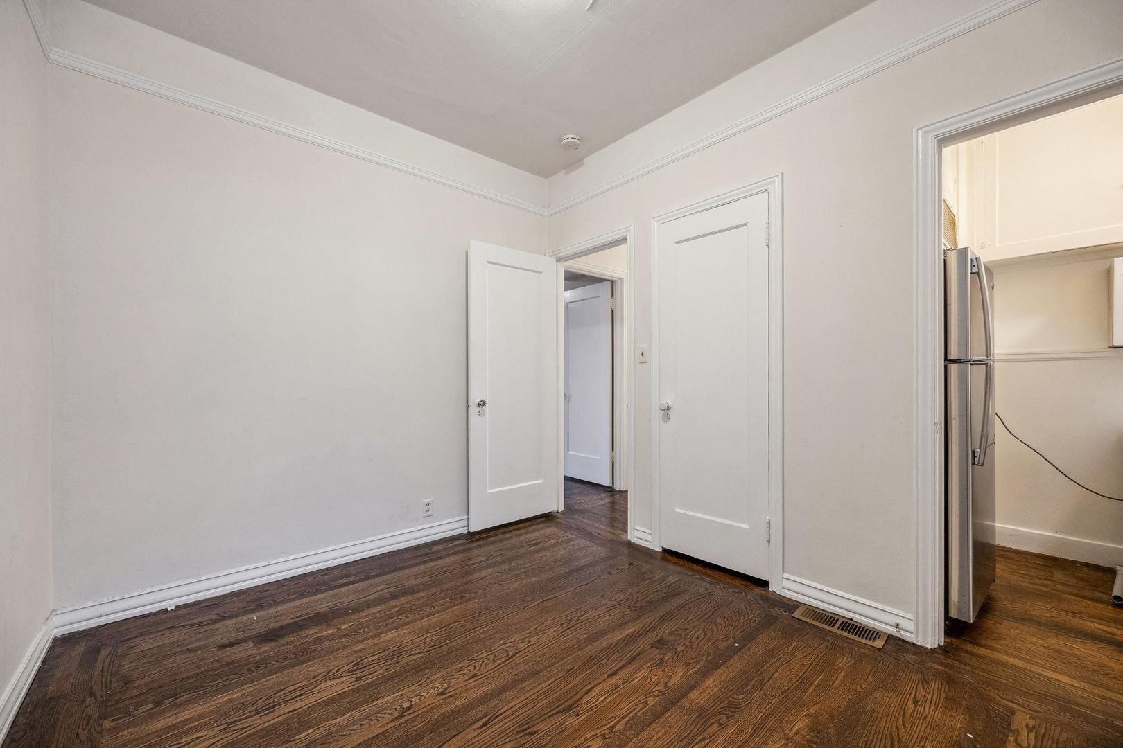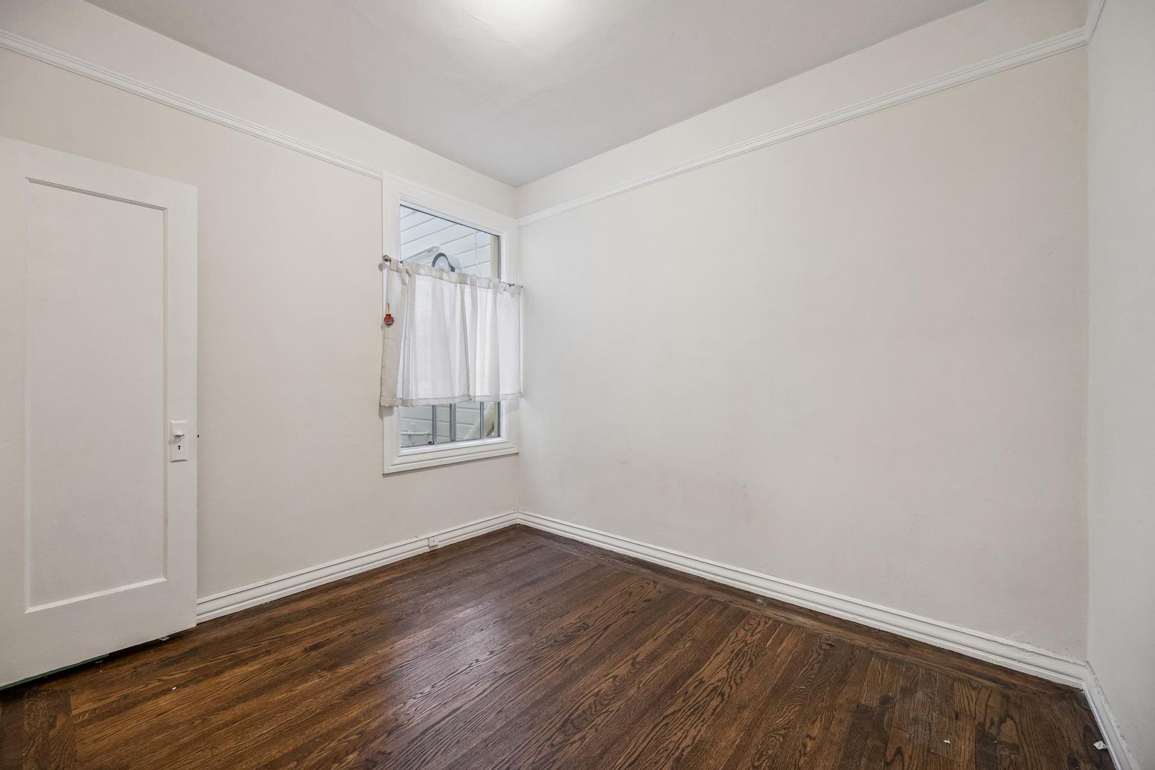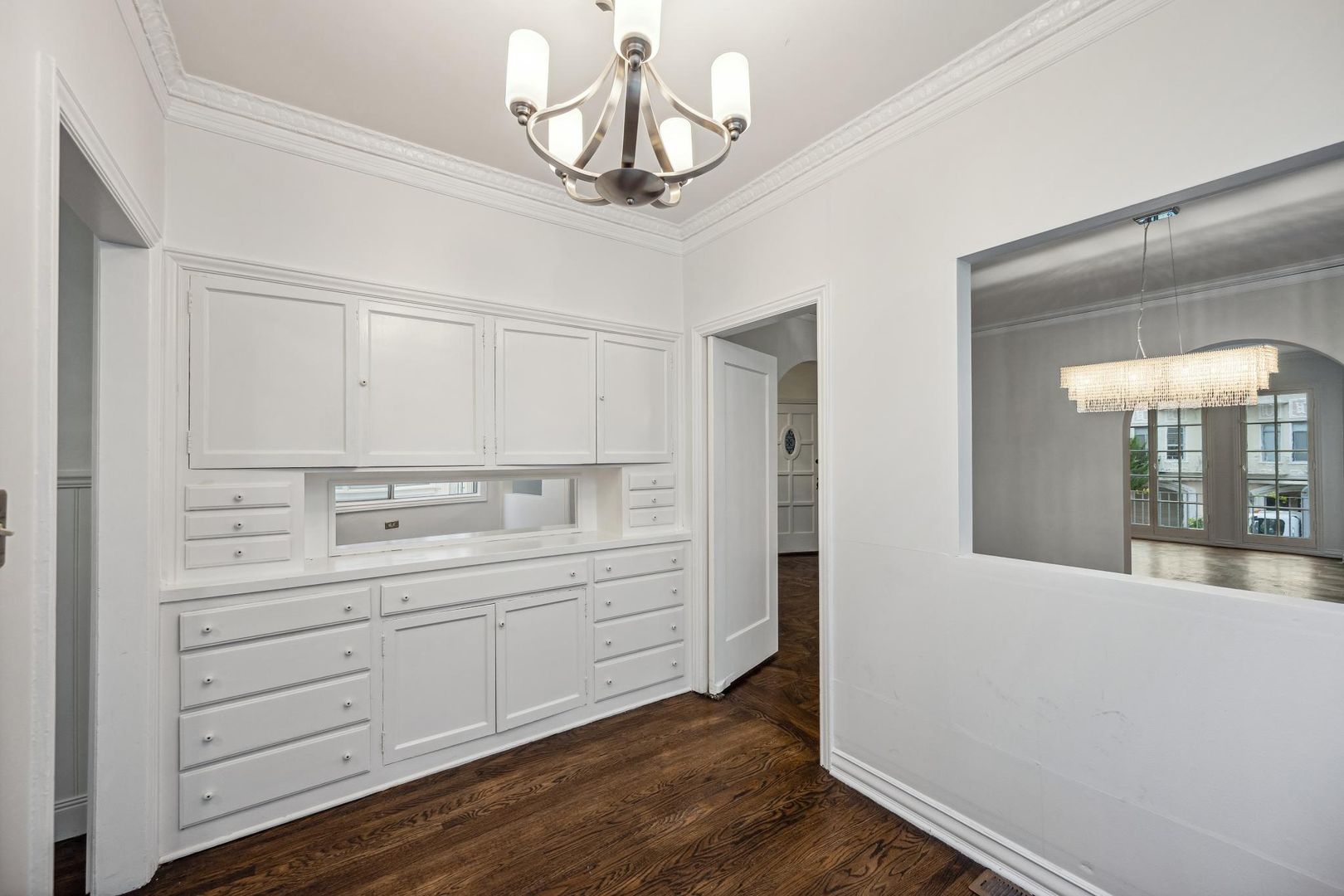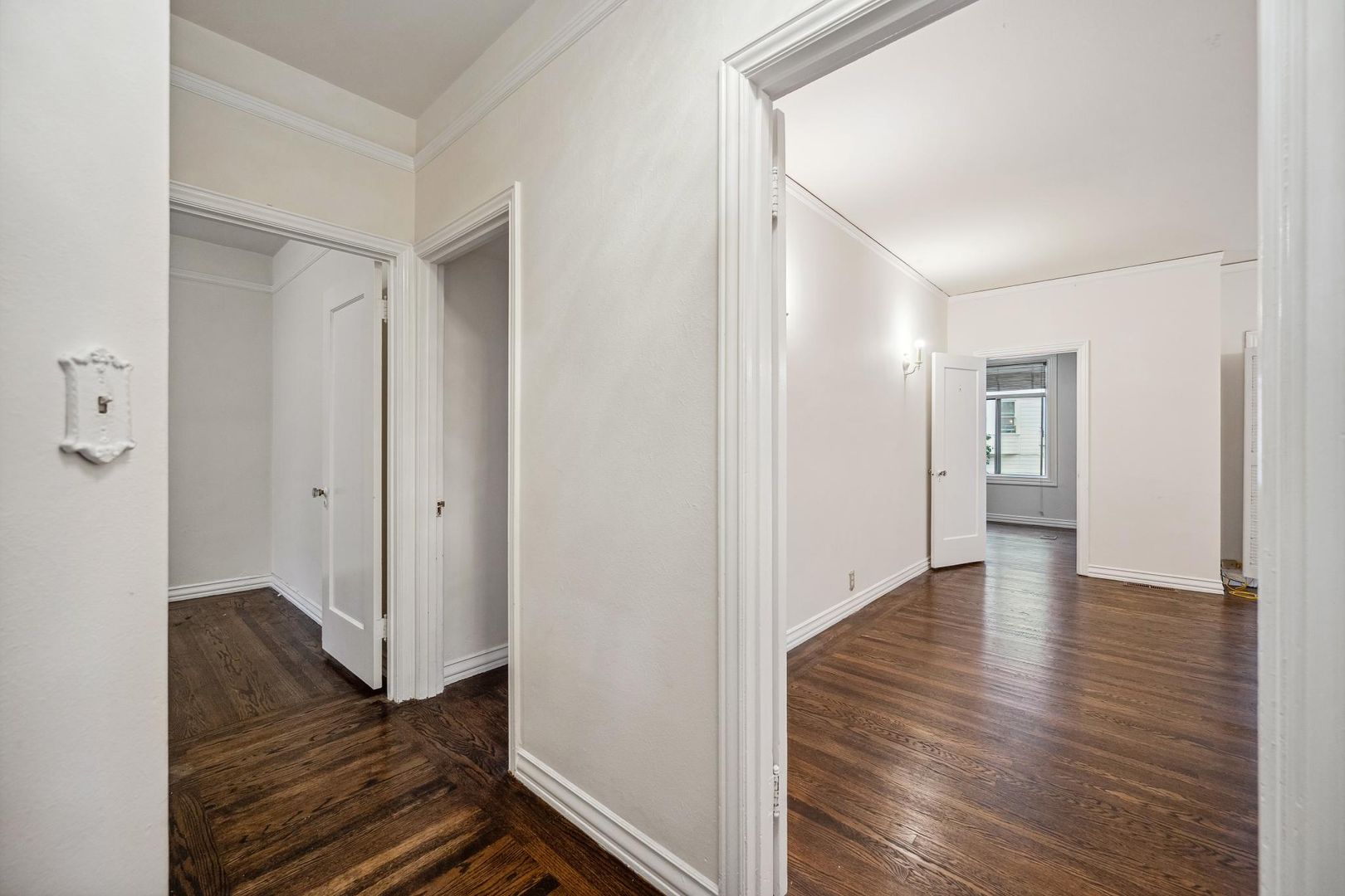 Top, second floor 4BR/2BA full flat in the Marina. Floors are hardwood except in kitchen and baths. Huge living room has arched windows facing the street and a decorative fireplace. The formal dining room is behind it and connects to the breakfast room. Breakfast room has a lot of cabinets, drawers and a counter. It is partially open and provides access to the kitchen on one side. Kitchen includes gas stove and dishwasher. A narrow room at the back of the kitchen has the refrigerator and side-by-side washer and dryer. It also has a good number of cabinets. All four bedrooms are at the back of the flat. They range in size from very large to small. The master bedroom is huge and connects to the master bath. Master bath is long and narrow. It is paneled in dark wood and has a Jacuzzi with shower at one end. The second bedroom is normal-sized and is accessed via the master bedroom. It is adjacent to the large, third bedroom. The fourth, small bedroom is next to the third bedroom. There is a linen closet just outside of it. Shared bath has shower-over-tub.