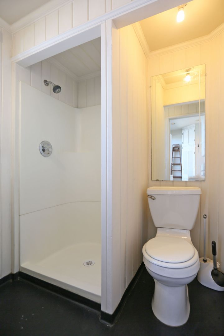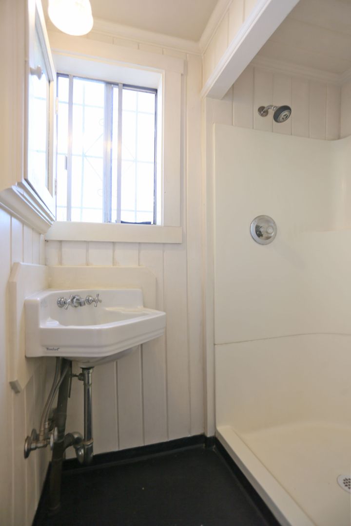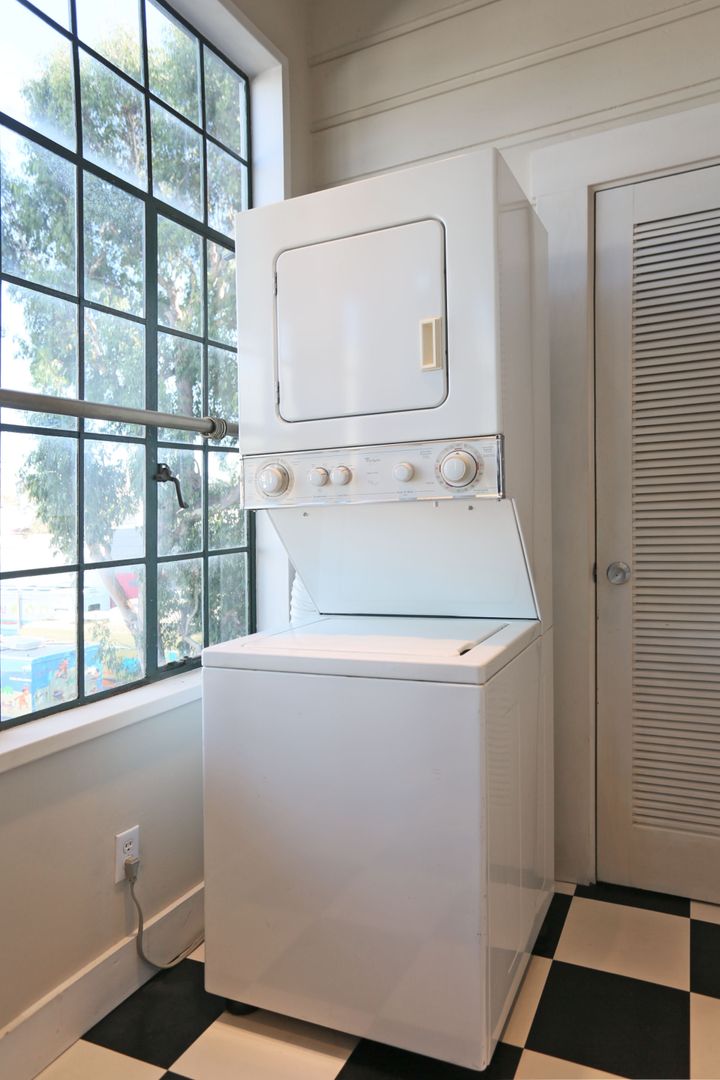 The laundry room is open to the kitchen and filled with natural light from a full wall of windows. It includes a stacked washer and dryer and provides direct access to the bathroom and private outdoor deck. The bathroom features a shower stall. From the laundry room, stairs lead down to a private deck with a built-in ledge ideal for plants or additional outdoor use.