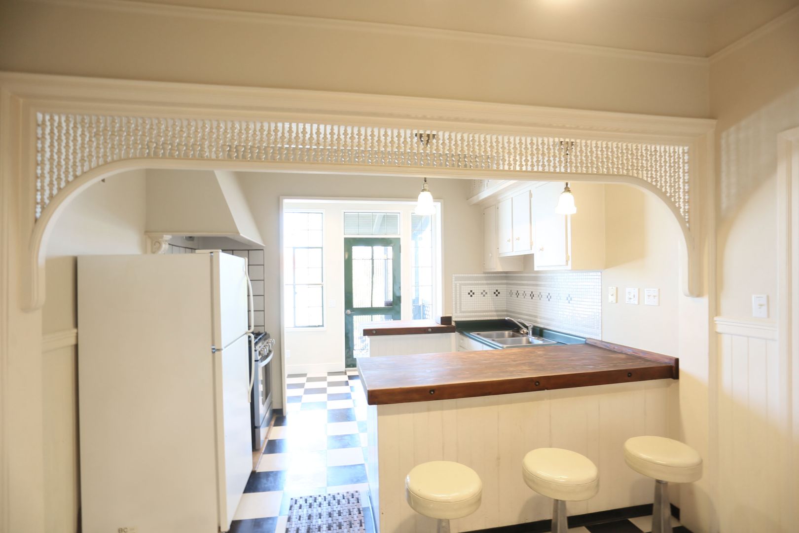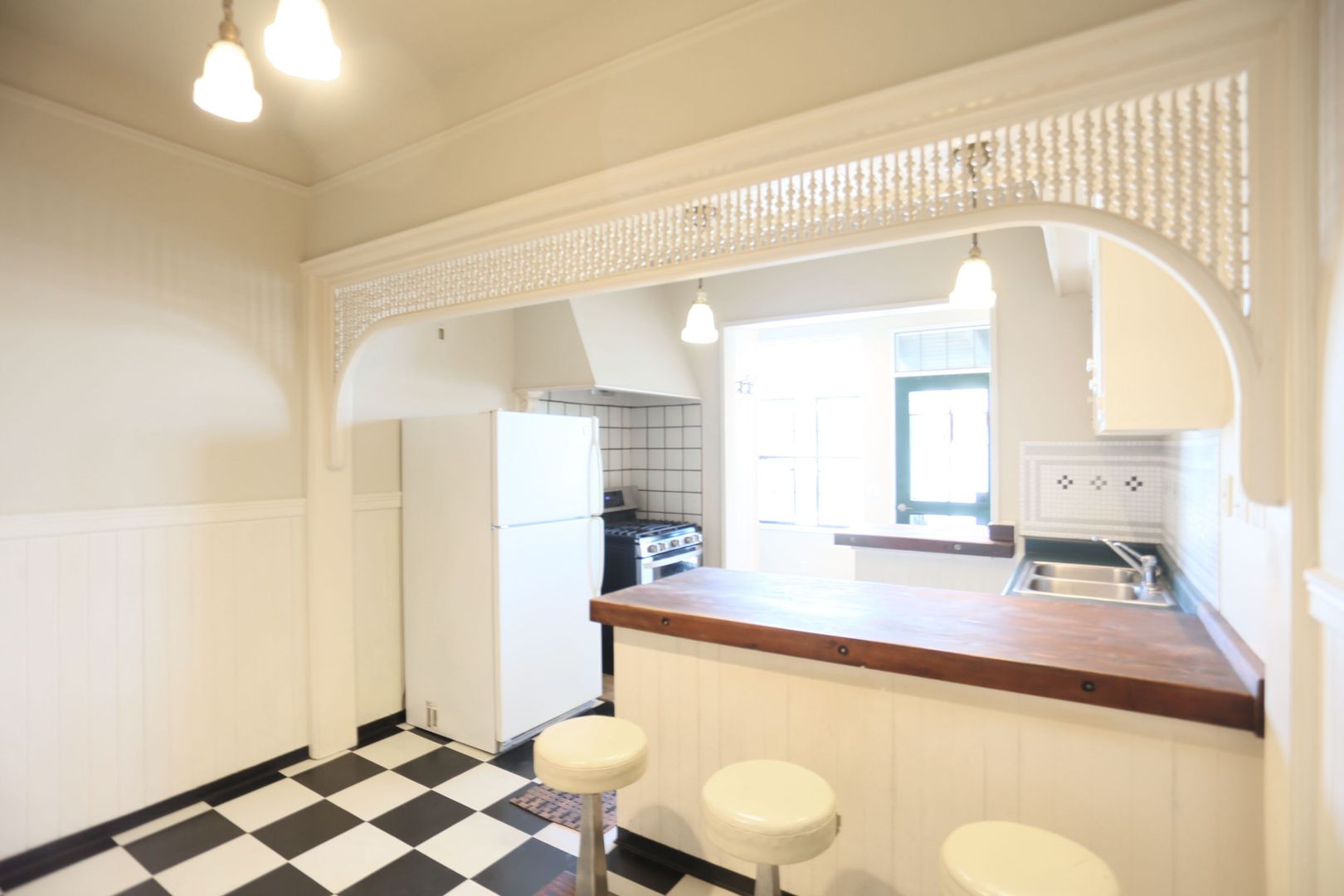 South of Market, second/top-floor 2BR/1BA flat showcasing classic San Francisco charm with beautiful original detailing throughout. The home features hardwood floors in the main living areas, with tile in the kitchen, laundry room, and bath. The living room sits at the top of the stairs and flows into a formal dining area through an elegant archway. The kitchen is located adjacent to the dining room and includes a gas stove, two wood countertops, and a breakfast bar with seating for three.