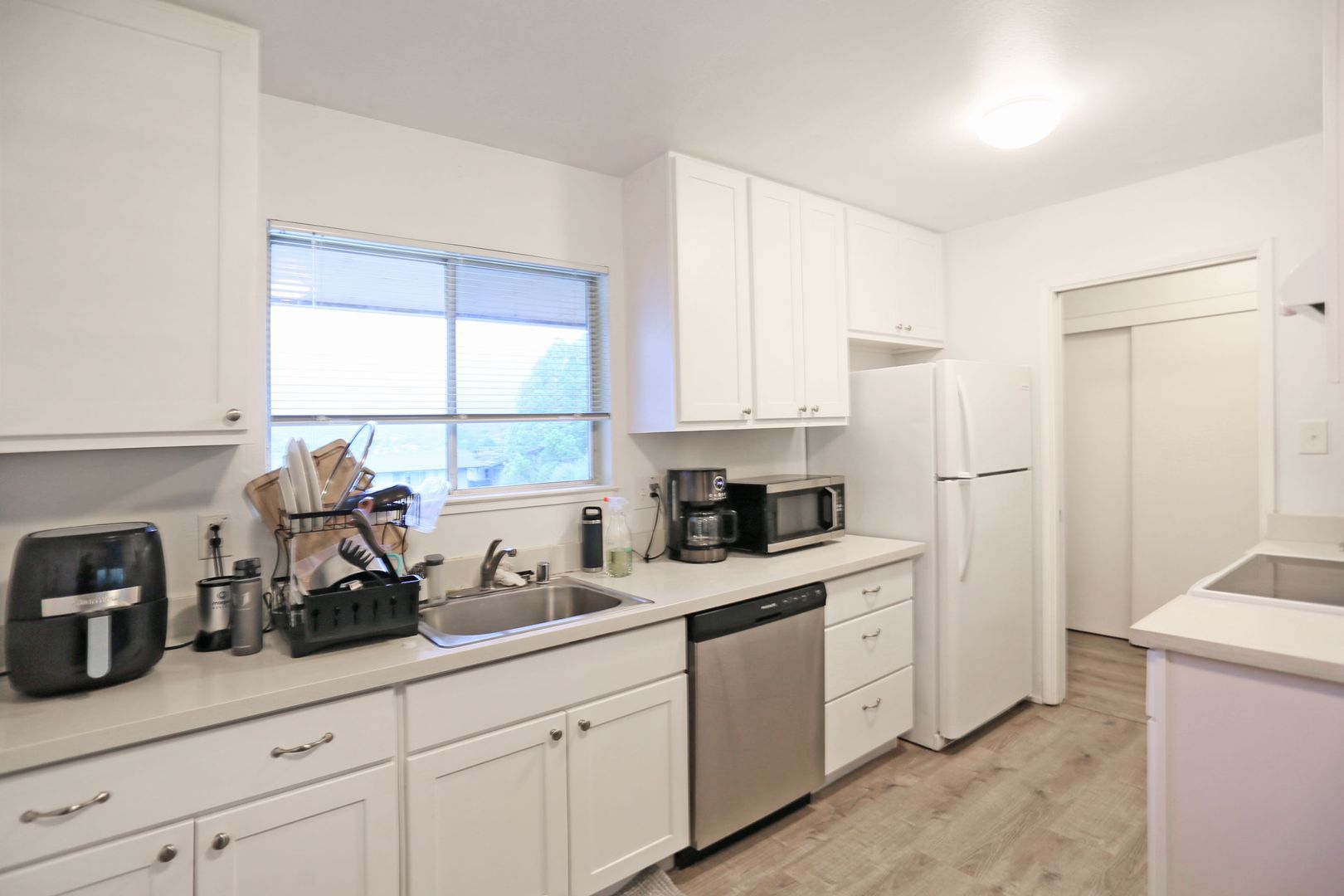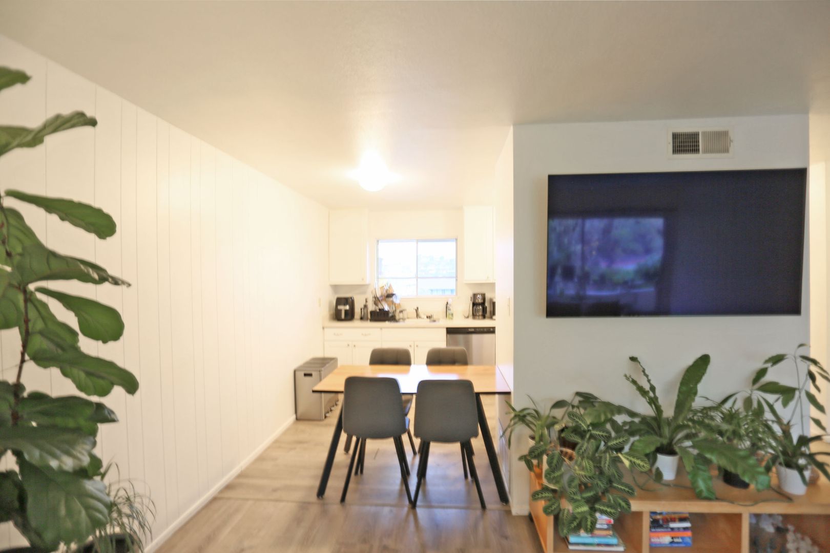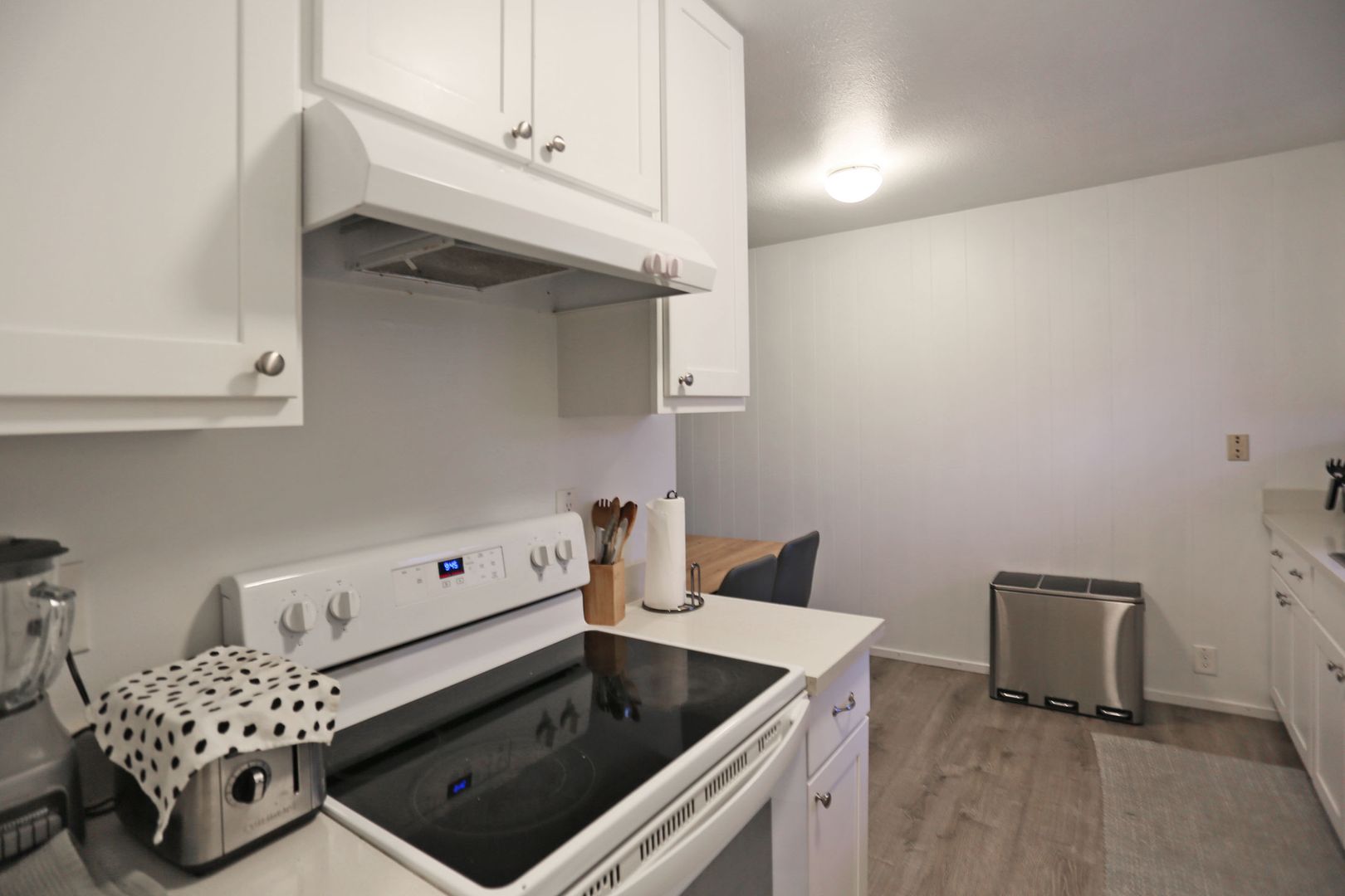 The galley-style kitchen is located just off the living room and includes an stove and dishwasher. There is ample space between the kitchen and living room for a dedicated dining area.