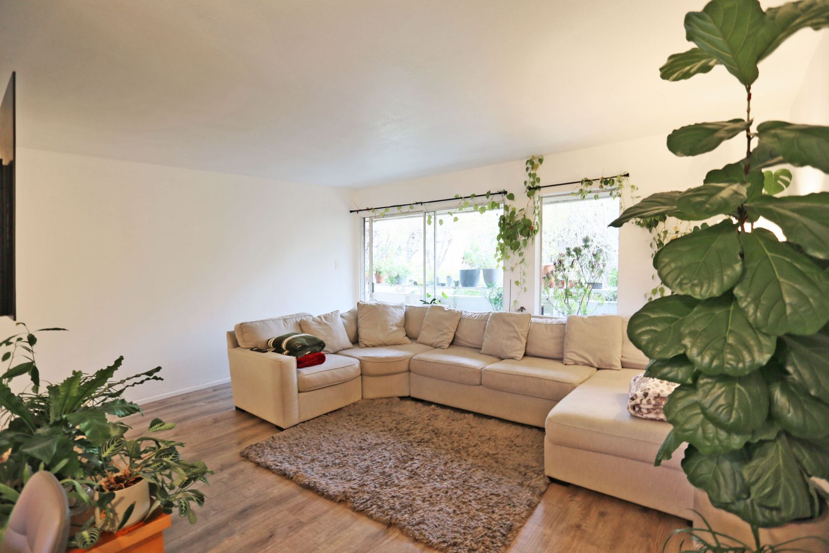 Located on the top floor, this bright and spacious 2BR/2BA apartment offers comfortable living in a highly desirable Tiburon neighborhood. The expansive living room features a full wall of floor-to-ceiling windows, providing abundant natural light and direct access to a long, narrow private deck shared by the living room and both bedrooms. Faux wood laminate flooring runs throughout the home, with tile flooring in the bathrooms.
