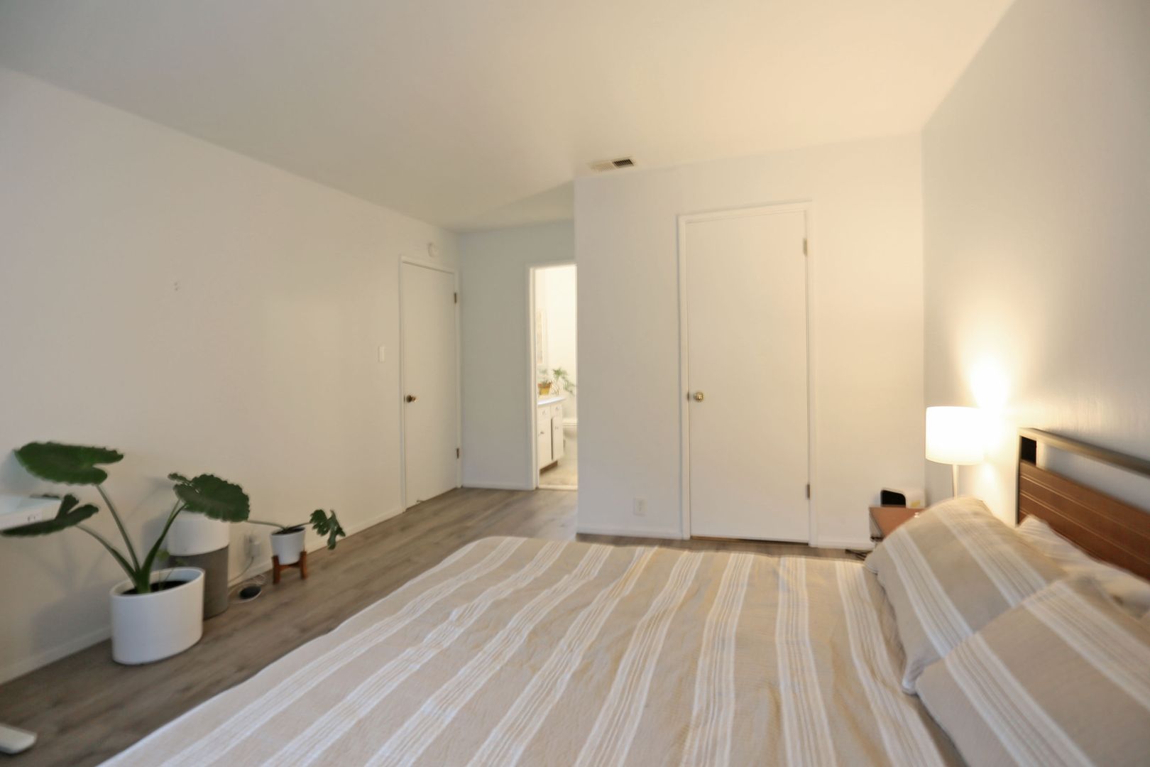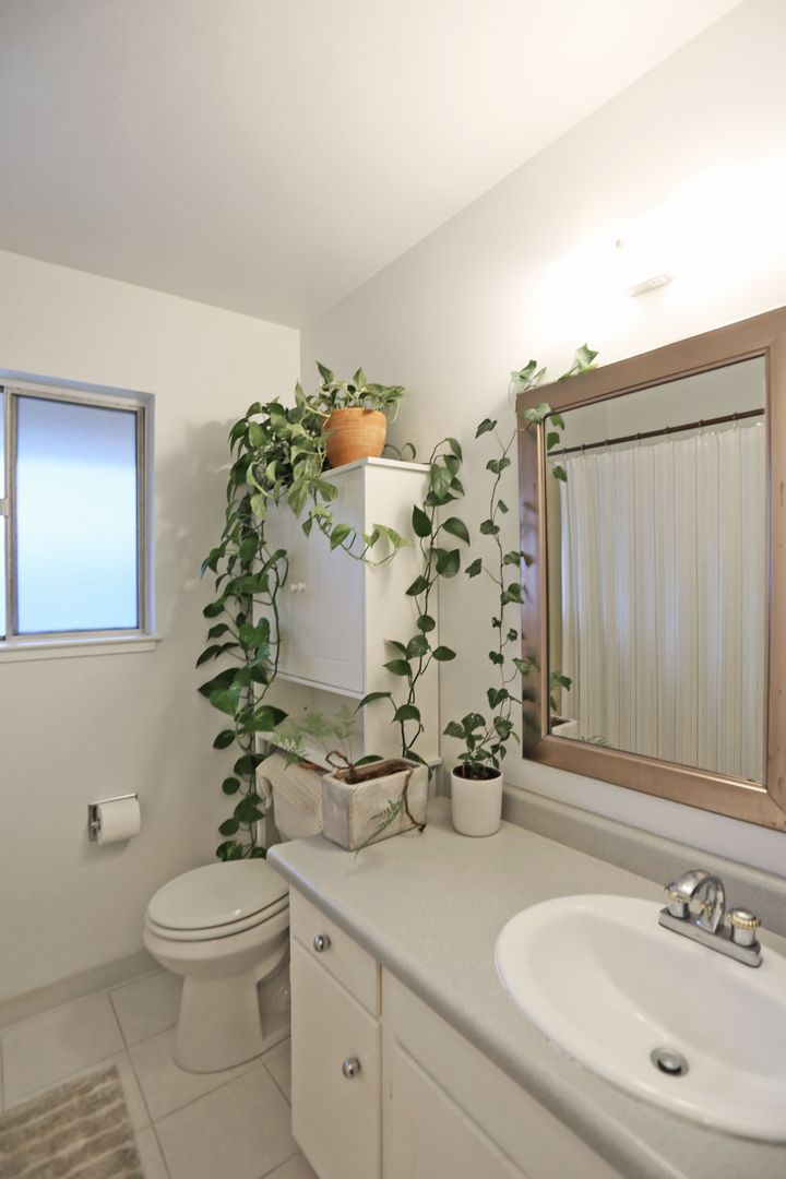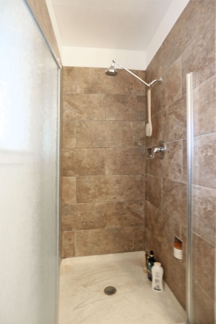 The primary bedroom features a large walk-in closet and an en-suite bathroom with a shower stall. The second bedroom includes a wall closet with curtain enclosure. The main bathroom offers a shower-over-tub. Two additional storage closets are located near the entry for added convenience.