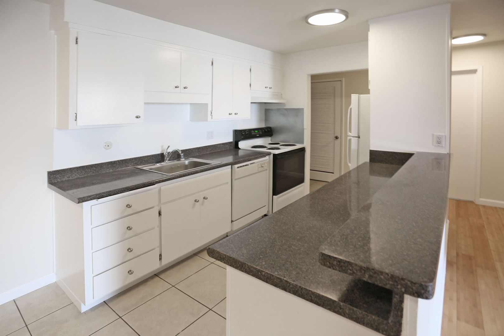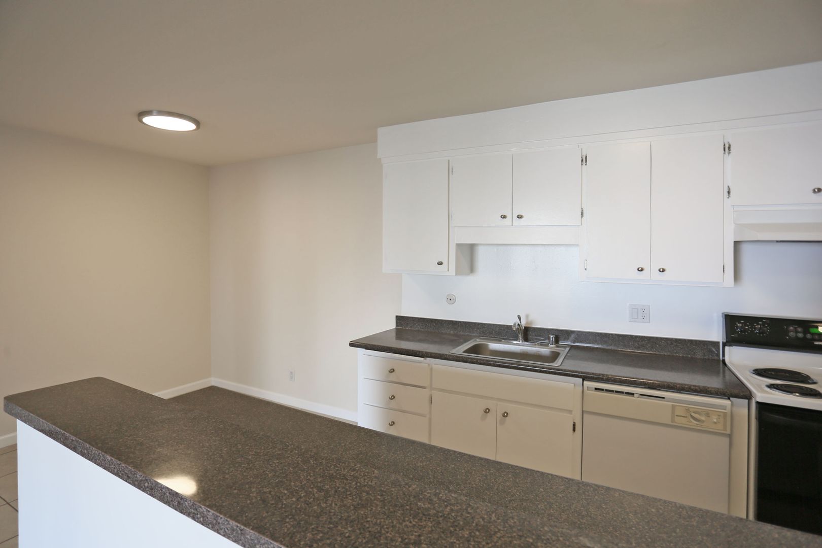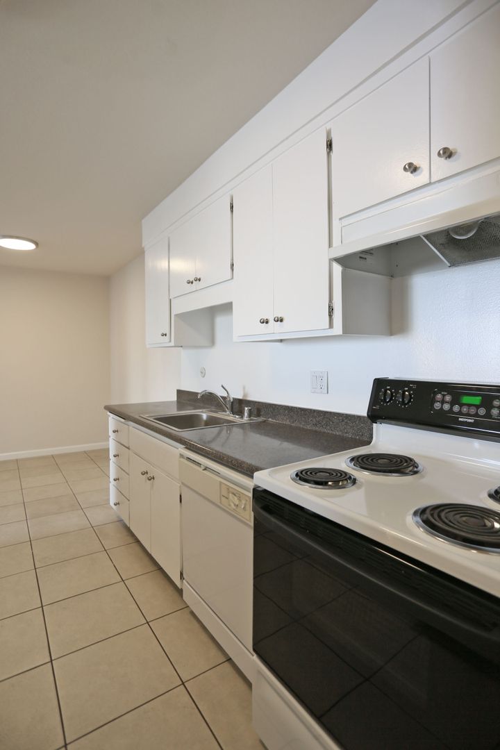 Contemporary 1BR/1BA in Adams Point. Large living room provides access to the balcony; the kitchen and dining room are at the back of the living room with the kitchen separated by a breakfast bar. Kitchen includes an electric stove and dishwasher. Dining space is across from the opening to the kitchen. Breakfast bar can seat four. Hallway has a large closet. Bedroom is bright with a full wall, four-panel, mirror door closet. Bath has shower-over-tub with sliding glass doors.
