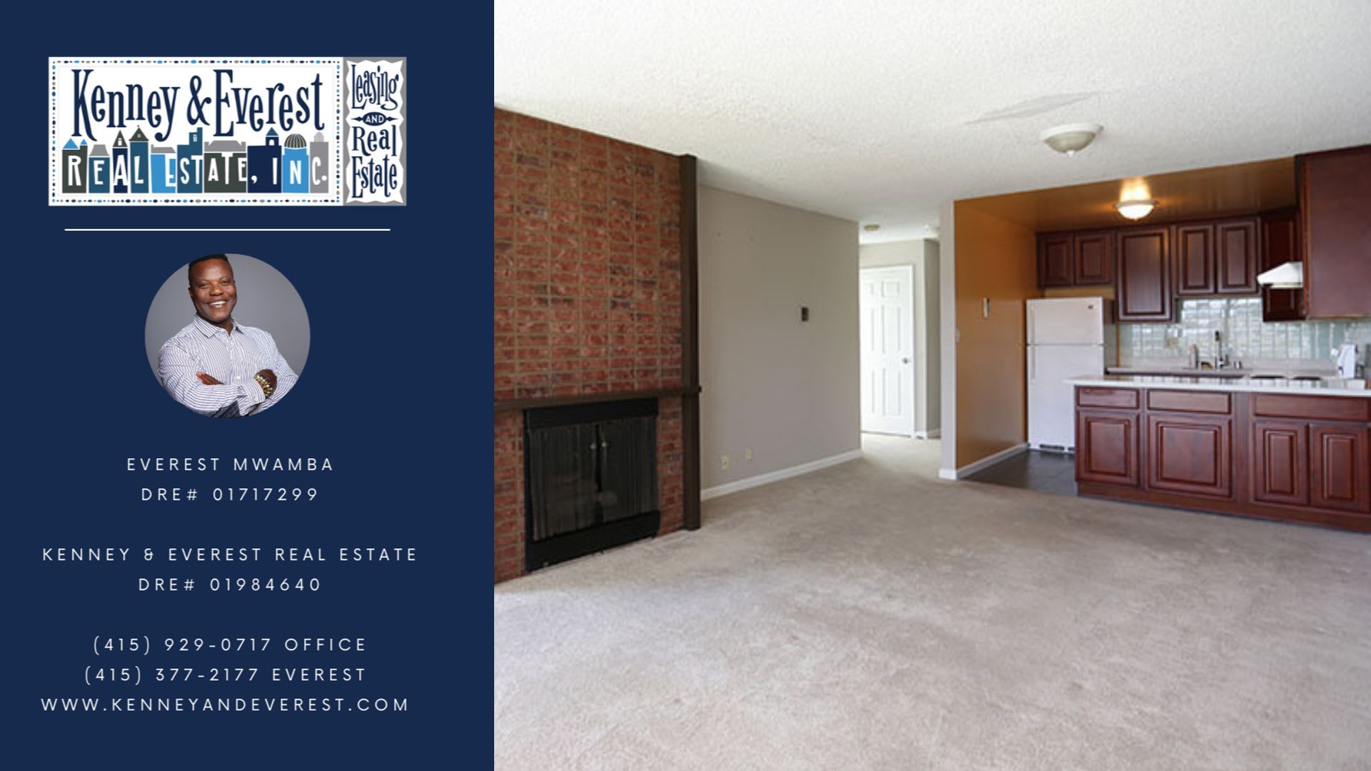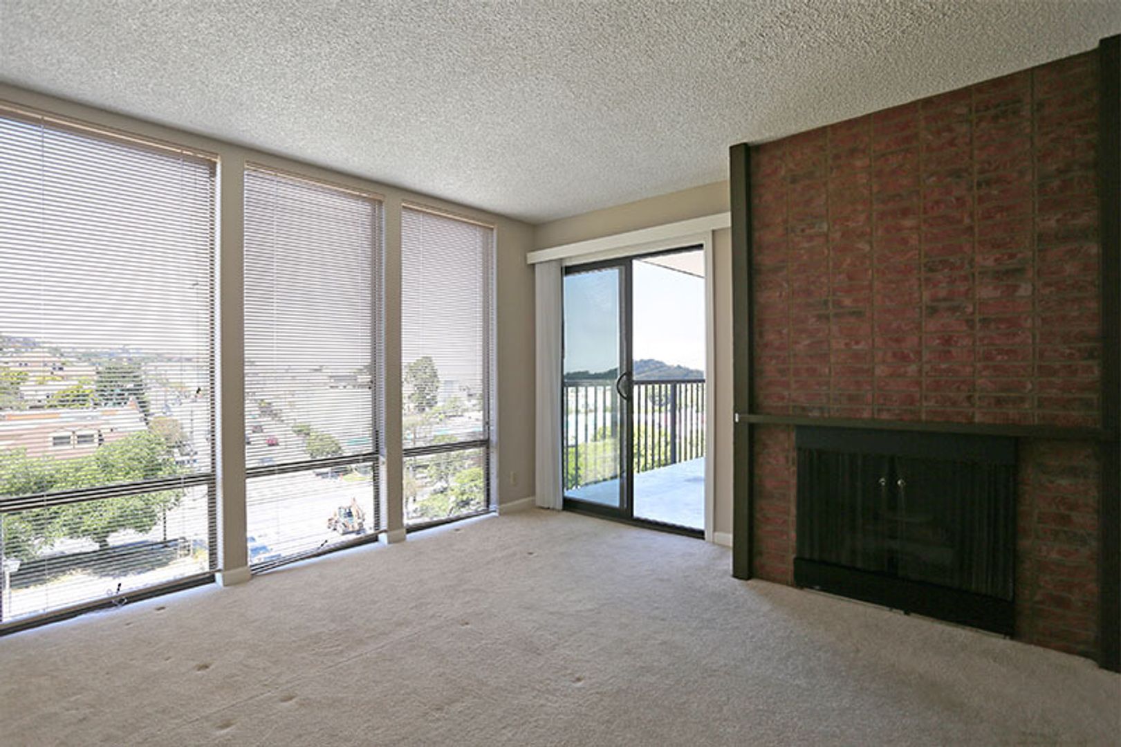 Contemporary, top, third floor 1BR/1BA in the Forest Knolls district, about a block from Mt. Sutro, three from UCSF. Apartment faces north-west. Floors are carpeted except for kitchen and bath. Open living room has windows and deck with a slight view of the Pacific at one end, kitchen with bar-seat style dining counter at the other. It has a decorative fireplace. Kitchen has lots of cabinets, includes electric stove and dishwasher. Both living room and bedroom have sliding glass doors to the balcony. Bedroom has large wall closet with sliding mirror doors. Bath has shower-over-tub with sliding glass doors and skylight. Hall closet is just outside the door to the bedroom.