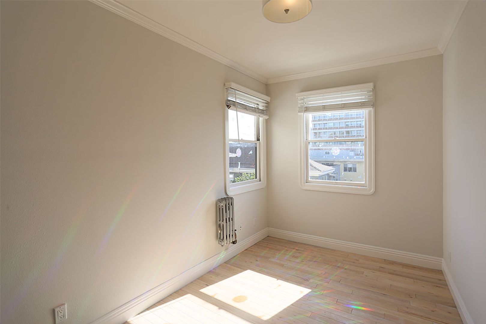 Modern, remodeled second floor 1BR/1BA just north of the western tip of Oakland's Lake Merritt. Floors are hardwood except in bath, heat is steam. Living room is bright with a large bank of three windows. Kitchen is C-shaped, has all stainless appliances including gas stove and dishwasher. Bedroom has a closet with sliding mirror doors. Bath is standard with shower-over-tub.