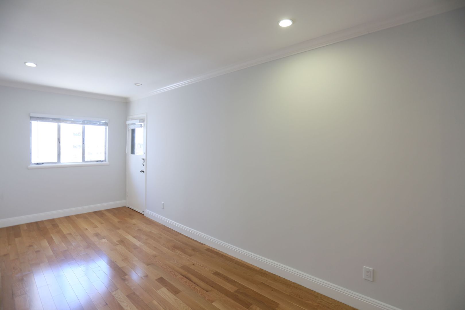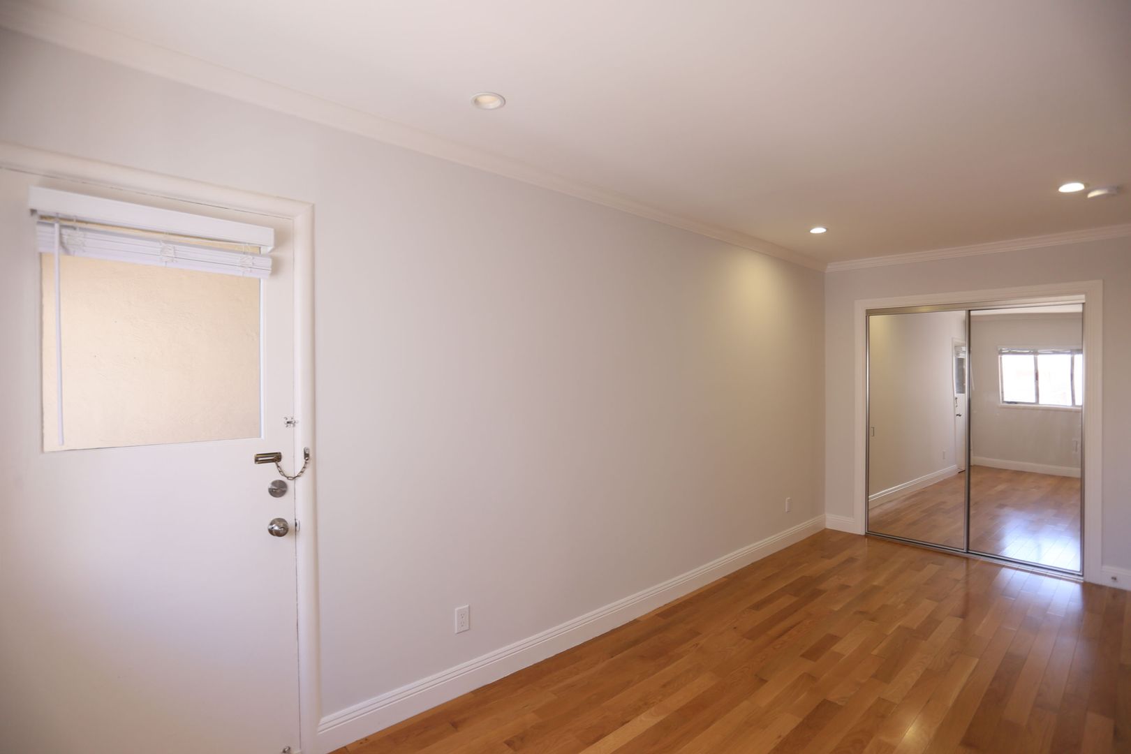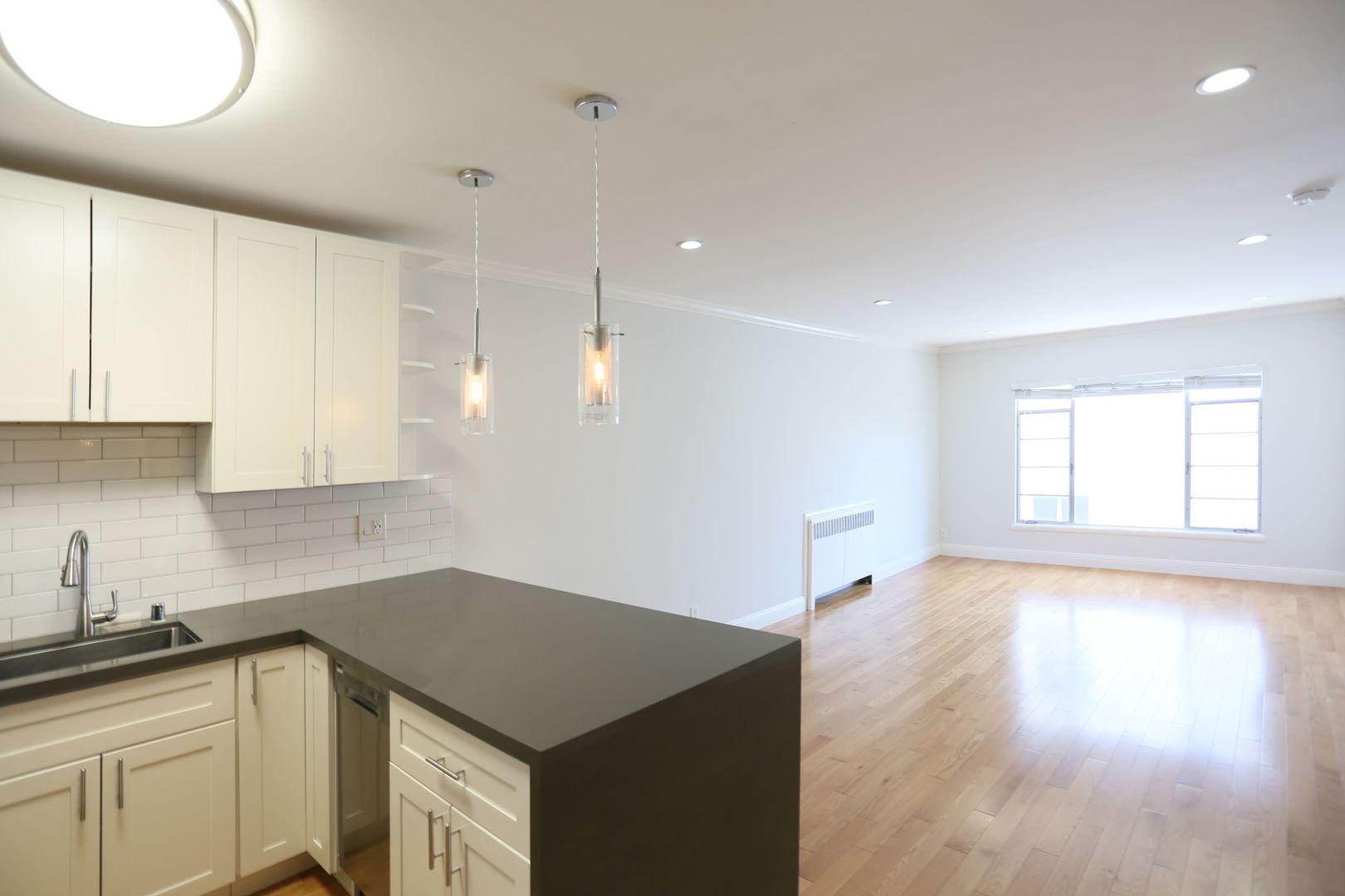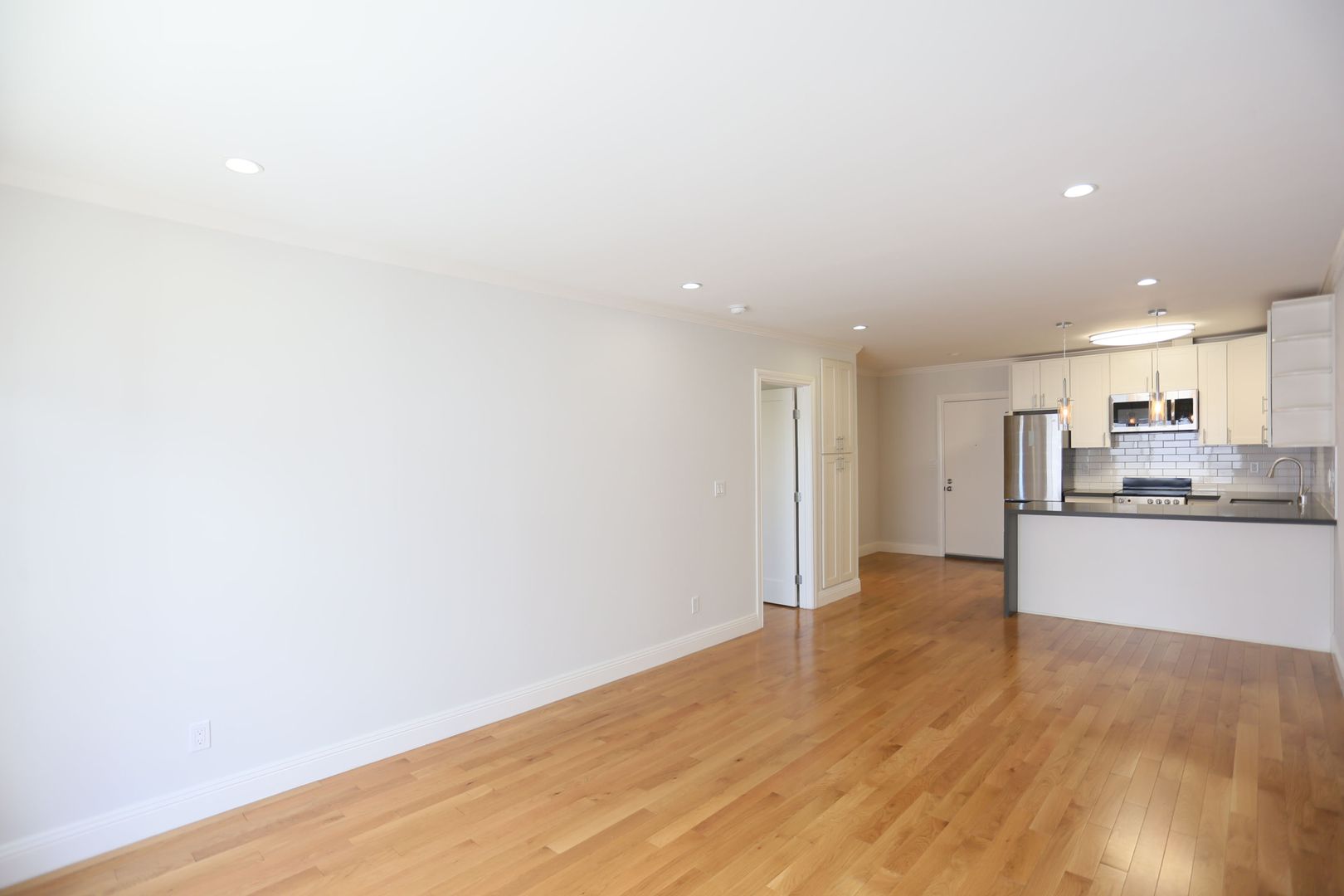 Modern, third floor 1BR/1BA just north of the western tip of Oakland's Lake Merritt. Floors are hardwood except in bath, heat is forced air. Bright, open living room has a wall with three windows and the kitchen at the far end in a corner. Kitchen includes stainless electric stove, microwave, dishwasher, and has a breakfast bar for two-three facing the living room. Bedroom has a wall closet with sliding mirror doors. It has a door to an interior stairwell. Bath has shower-over-tub.