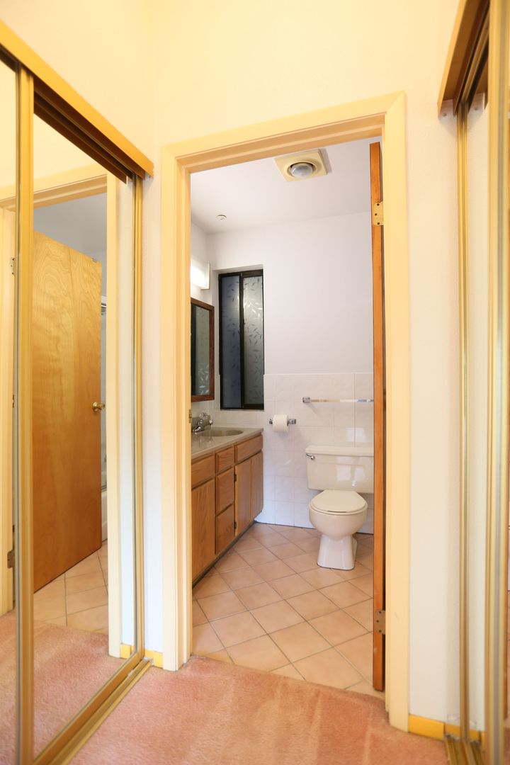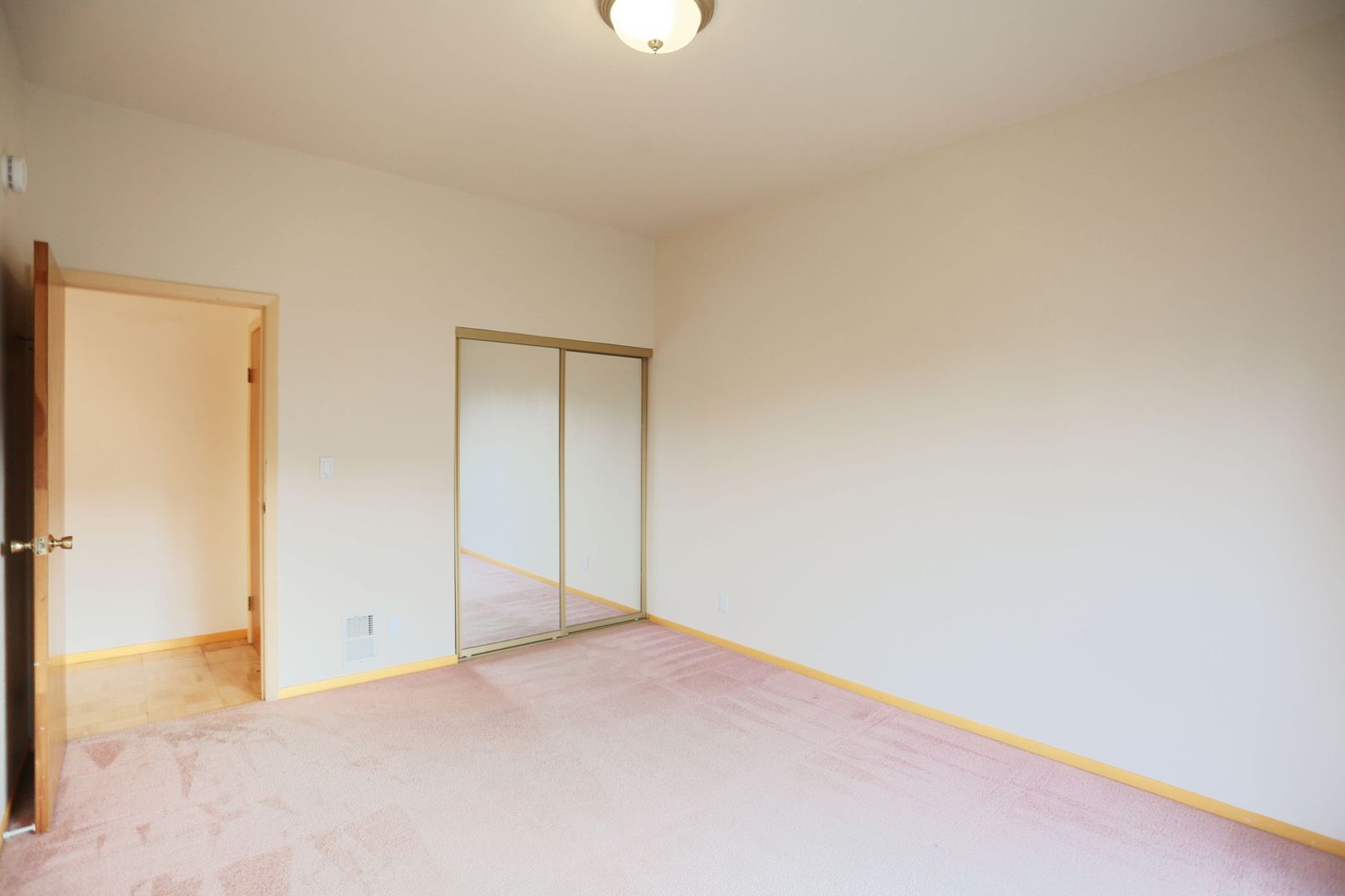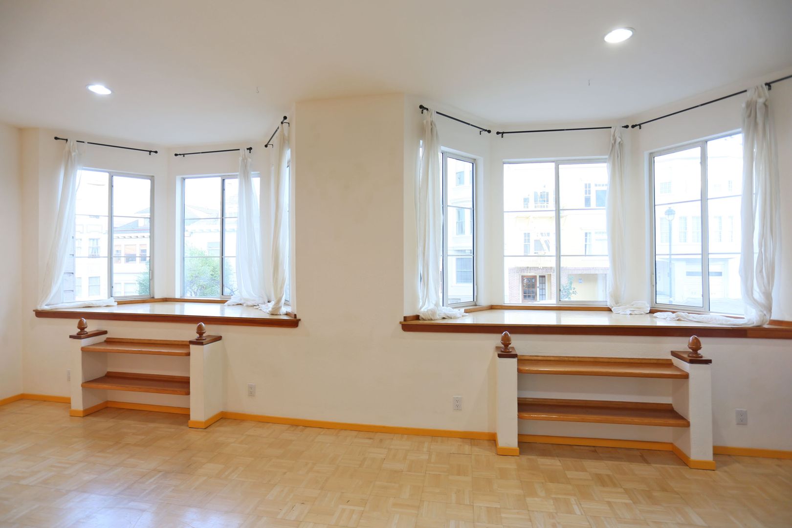 Elegant 3BR/2BA flat in the Sunset near the Haight-Ashbury neighborhood. Floors are hardwood, carpeted and tile. Heat is forced air. L-shaped, partially open living room has parquet hardwood floor, two large bay windows with seats and shelving, and a decorative fireplace with built-in shelves. Dining space is outside one of the kitchen's two doors, in front of one of the bay windows. Kitchen is in one corner of the living room. It includes gas range, double oven, dishwasher, and has lots of cabinets. Master bedroom is at the back of the flat, overlooking the yard. It is carpeted and has a short hallway with facing, sliding mirror door wall closets. It connects to the private bath. Bath has his-and-hers sinks and shower-over-tub with sliding glass doors. Second bedroom is adjacent to the master bedroom and also overlooks the yard. It is carpeted, has a wall closet with sliding mirror doors, and sliding glass doors opening onto the fire escape. Third bedroom is mid flat. It has parquet floor, washer and dryer in a closet with folding doors, and a standard closet. Shared bath has sliding glass doors and the linen closet is down the hall, next to the two rear bedrooms.
