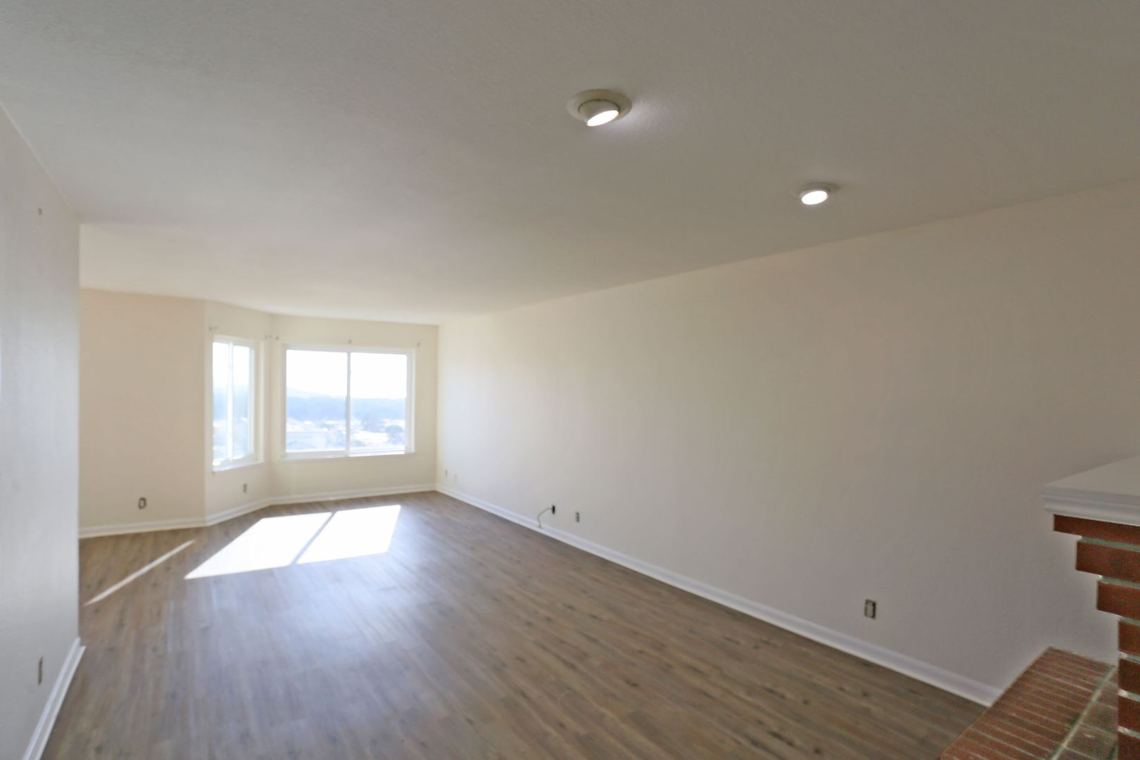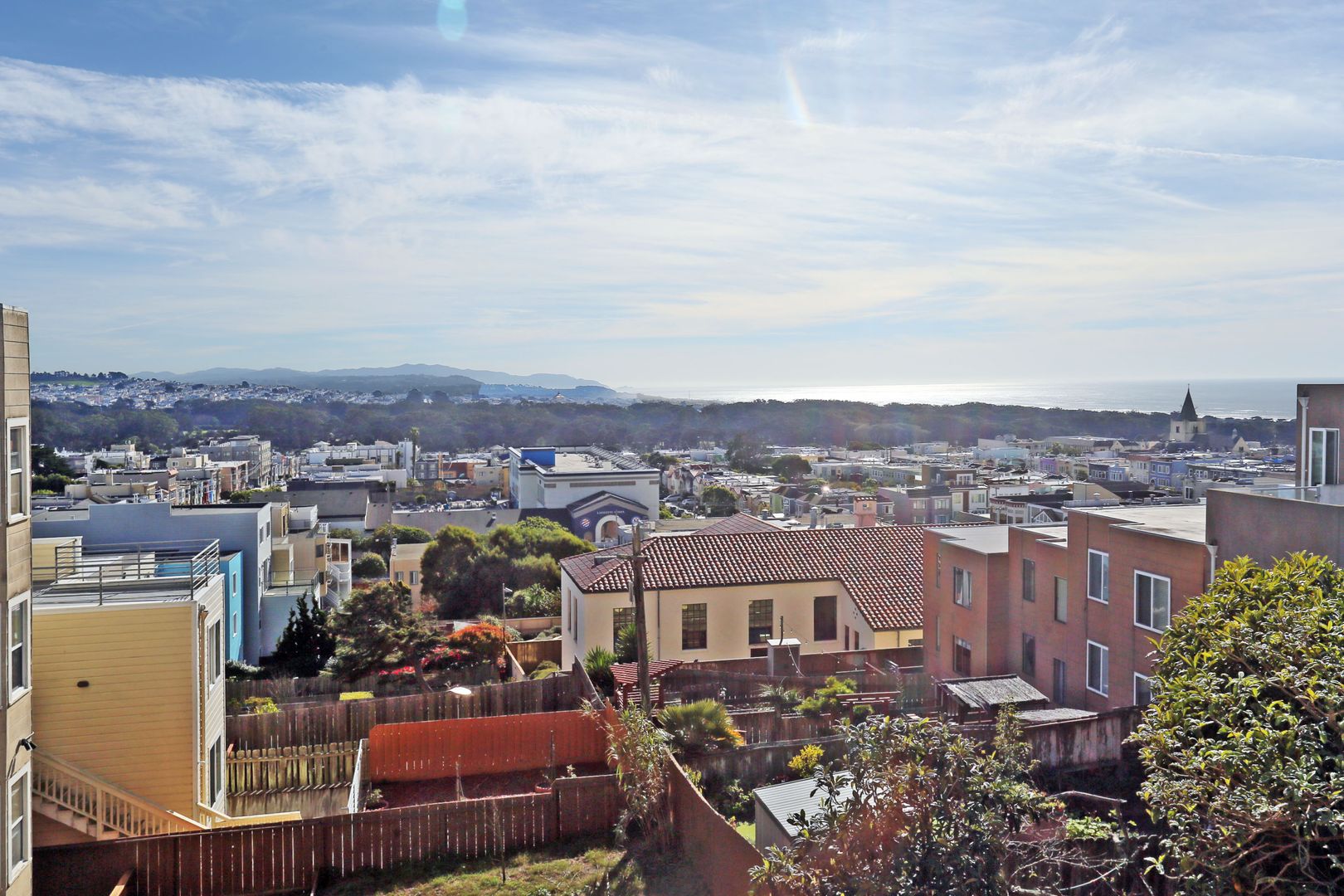Third floor 3BR/1BA condo in the Outer Richmond. Floors are hardwood except in baths. Windows are double pane and heat is via forced air. Apartment faces the back of the building. Huge, semi-open living room has a full wall of windows facing south. It has a stunning, panoramic view of the Pacific Ocean and southern peninsula hills. L-shaped living room has windows running fully along one side, the wood-burning fireplace at the far side of the L. Dining space is at the far corner from the fireplace and has the same view as the living room. Kitchen is inside an extruded square space inside the L's angle, with two entrances, one to the living room and fireplace, the other facing the dining space. Kitchen includes electric range with hood, separate stainless stove, stainless dishwasher, has granite counters, and lots of cabinet space. It also has space for a dining nook if desired. Master bedroom has its own bath. Bath is accessed via a hallway with facing mirror door wall closets. It has shower-over-tub with sliding glass doors. Both baths have granite sinks. Second bedroom is adjacent to the master bedroom, third bedroom is mid-unit. Both second and third bedrooms have wall closets with sliding mirror doors. Shared bath has shower-over-tub with sliding glass doors. There is a deep hall closet with shelves across from the bath.