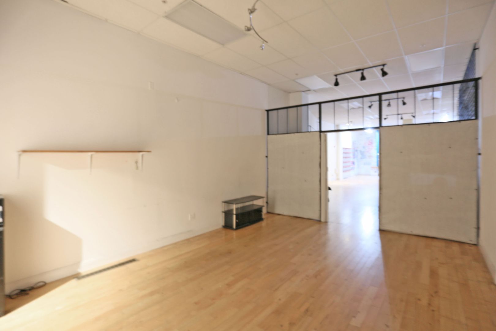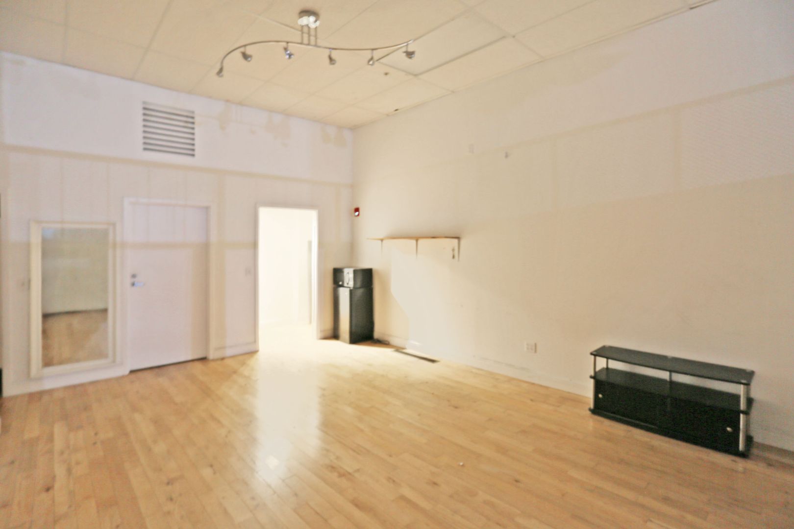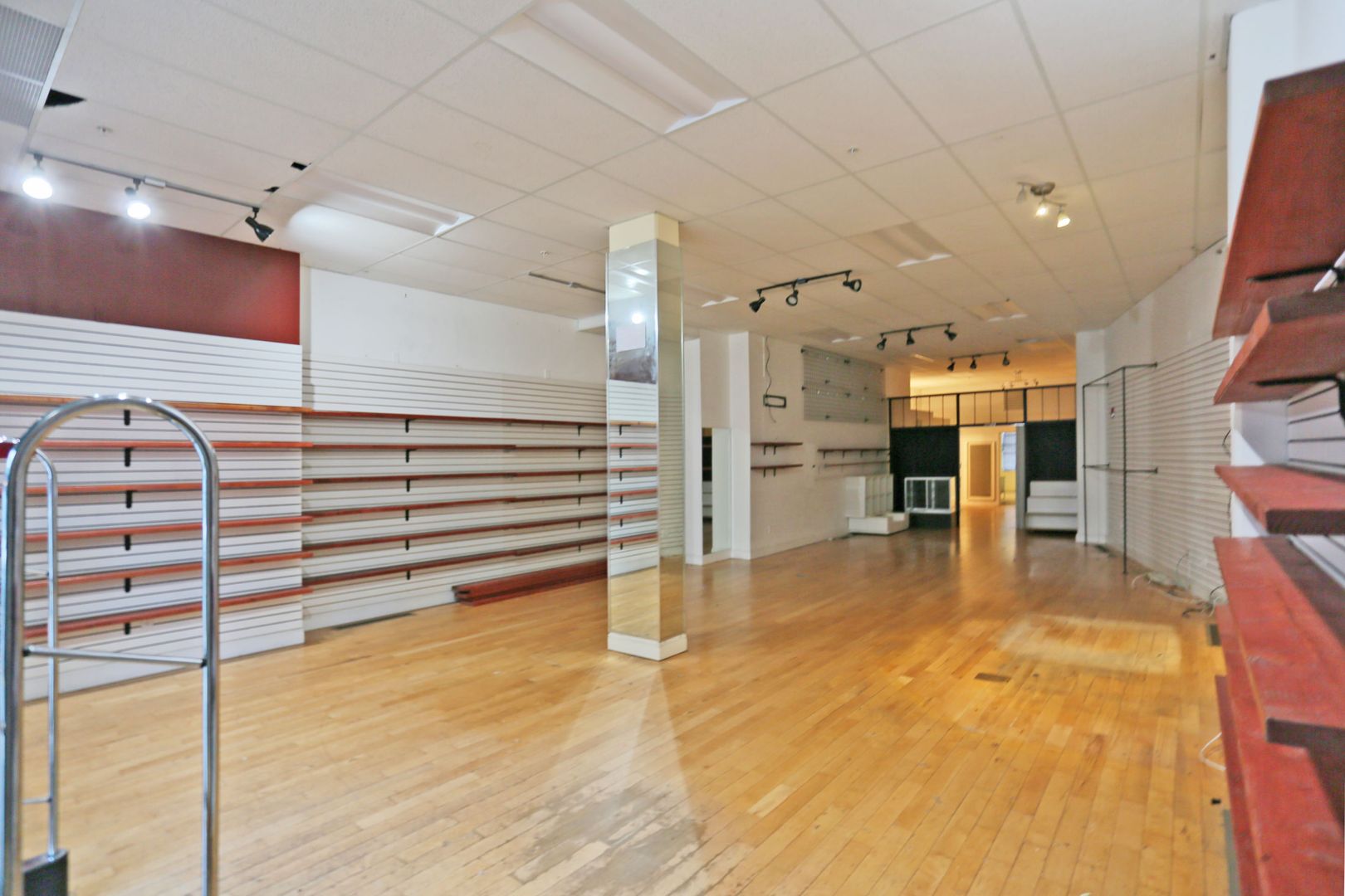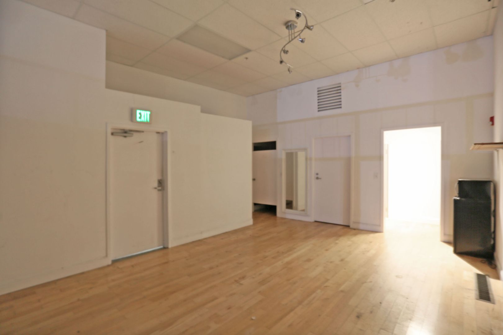 Floors are hardwood except in back office and storage/additional office space which are carpeted. Restroom is tiled. Large main space at the front of the store has an area at the back, approximately one fifth of the total front space, which is semi-partitioned and was used in part as an employee lounge. Three dressing rooms are accessed from this area. There is also a door to the rear of the venue which leads to a space that could partially be used for storage. It provides access to the restroom and an enclosed office.