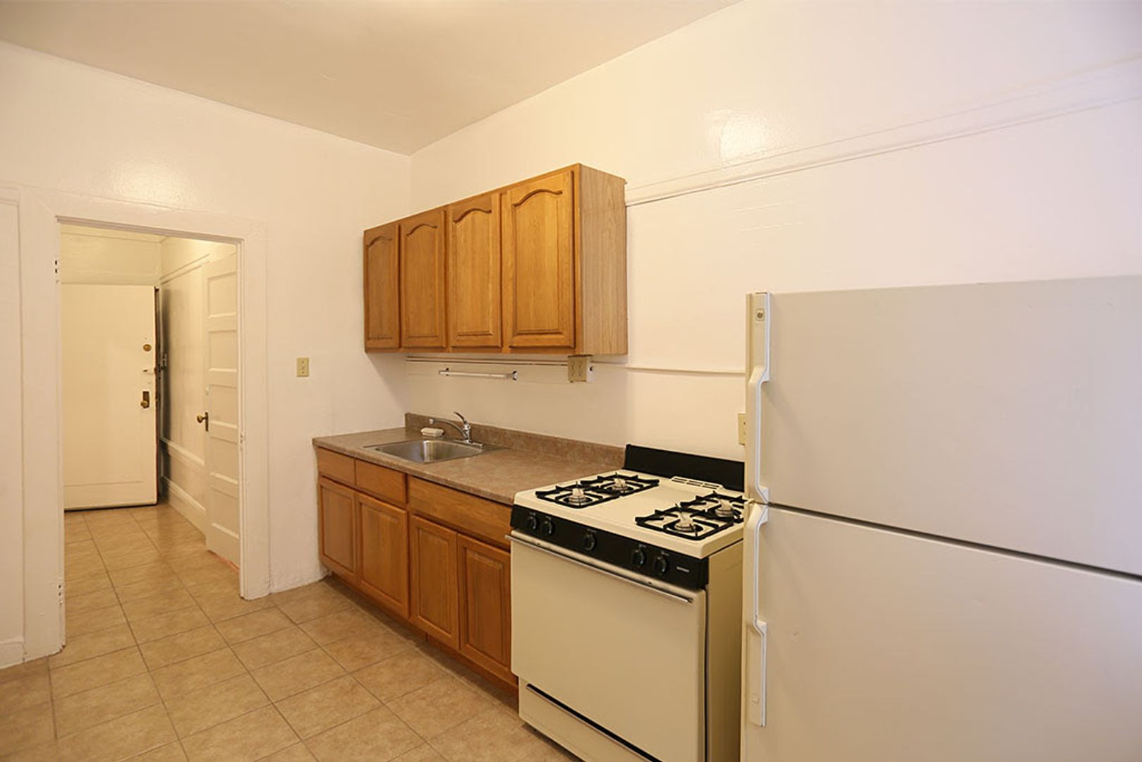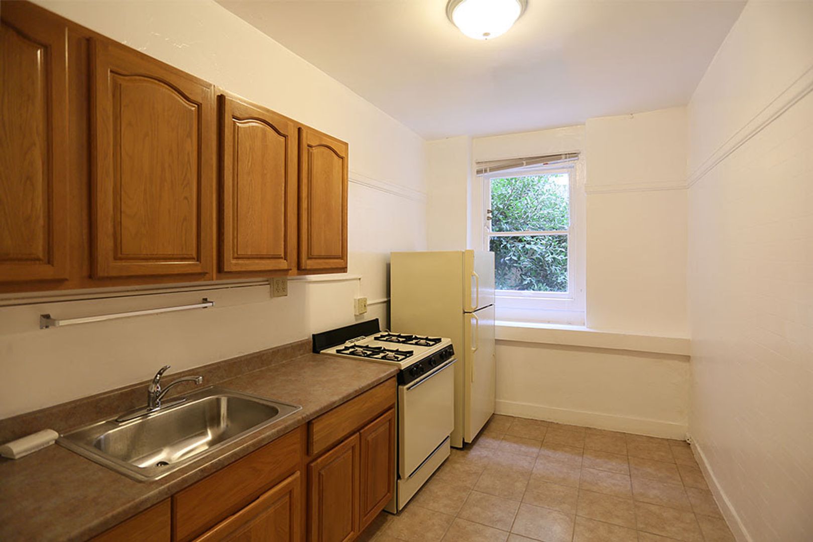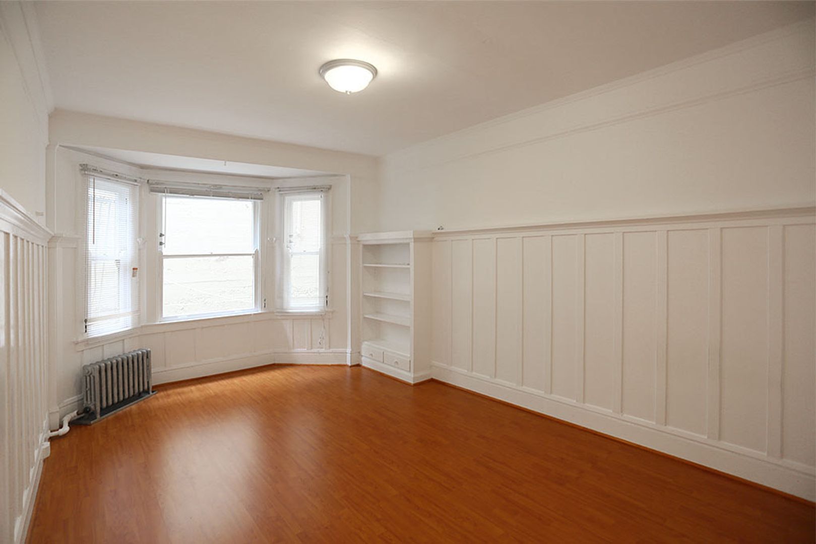 Downtown district first floor studio on Bush at Mason. Floors are hardwood laminate except in kitchen and bath; windows have blinds. Heat is steam. Large main room is bright with a bay window and has built-in shelving. It has a large closet. Kitchen includes a gas stove and has space for a small dining arrangement. Hallway has a second large closet. Bath is standard with shower-over-tub.