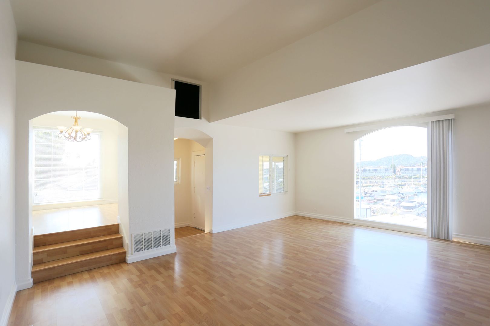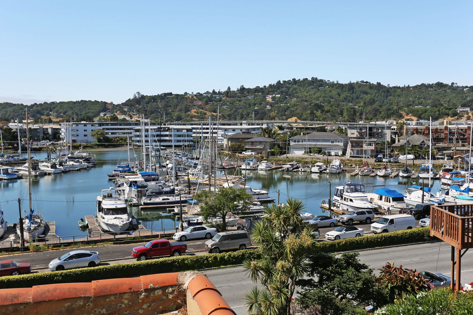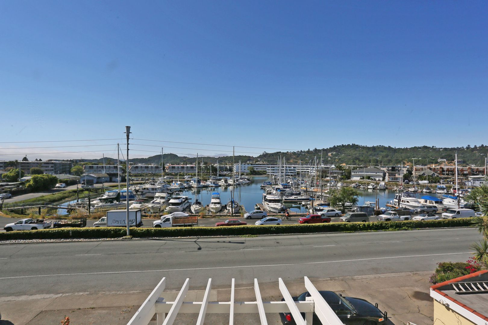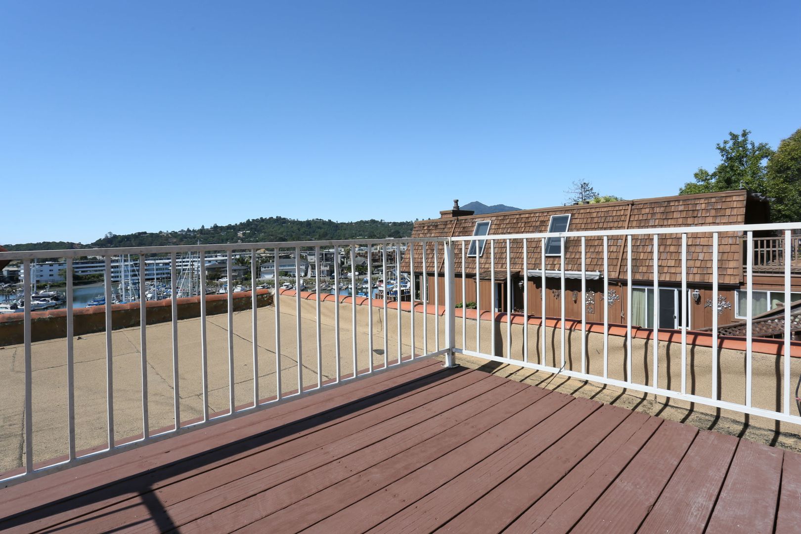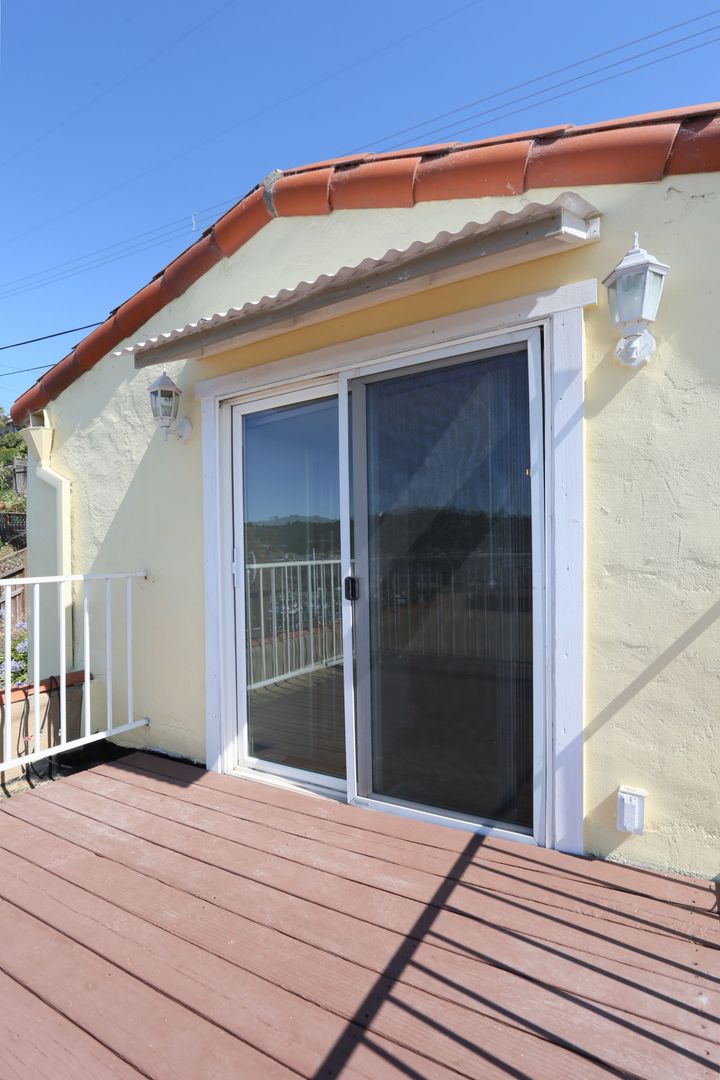 Gorgeous, top two floors 3BR/2.5BA facing San Rafael's Waterfront. The home is accessed via stairs from street level and has a secure door between the street and the unit itself. There is a porch between the stairs and the entrance to the apartment. Large living room has a wood-burning fireplace. It connects to the dining room and central hallway. It has a nice view of the marina across the street. Dining room provides access to the kitchen. Galley-style kitchen includes gas stove, microwave, dishwasher and lots of cabinet space. It has a pantry with shelves. Kitchen has sliding glass doors that open onto the yard. Terraced yard has a concrete-paved area. There are two bedrooms and two full baths on the main, lower floor. One bedroom has a large standard closet; the other has a wall closet with sliding mirror doors. Main bath is in the central hallway near the kitchen. It has shower-over-tub and his and hers sinks. The second bath has a glass shower stall. It is accessed through the second bedroom and is adjacent to the washer and dryer. A staircase leads up to the top floor from the laundry. The top floor is a bedroom with private deck and half bath. The deck is accessed via sliding glass doors and has a view of the marina and Mt. Tam.