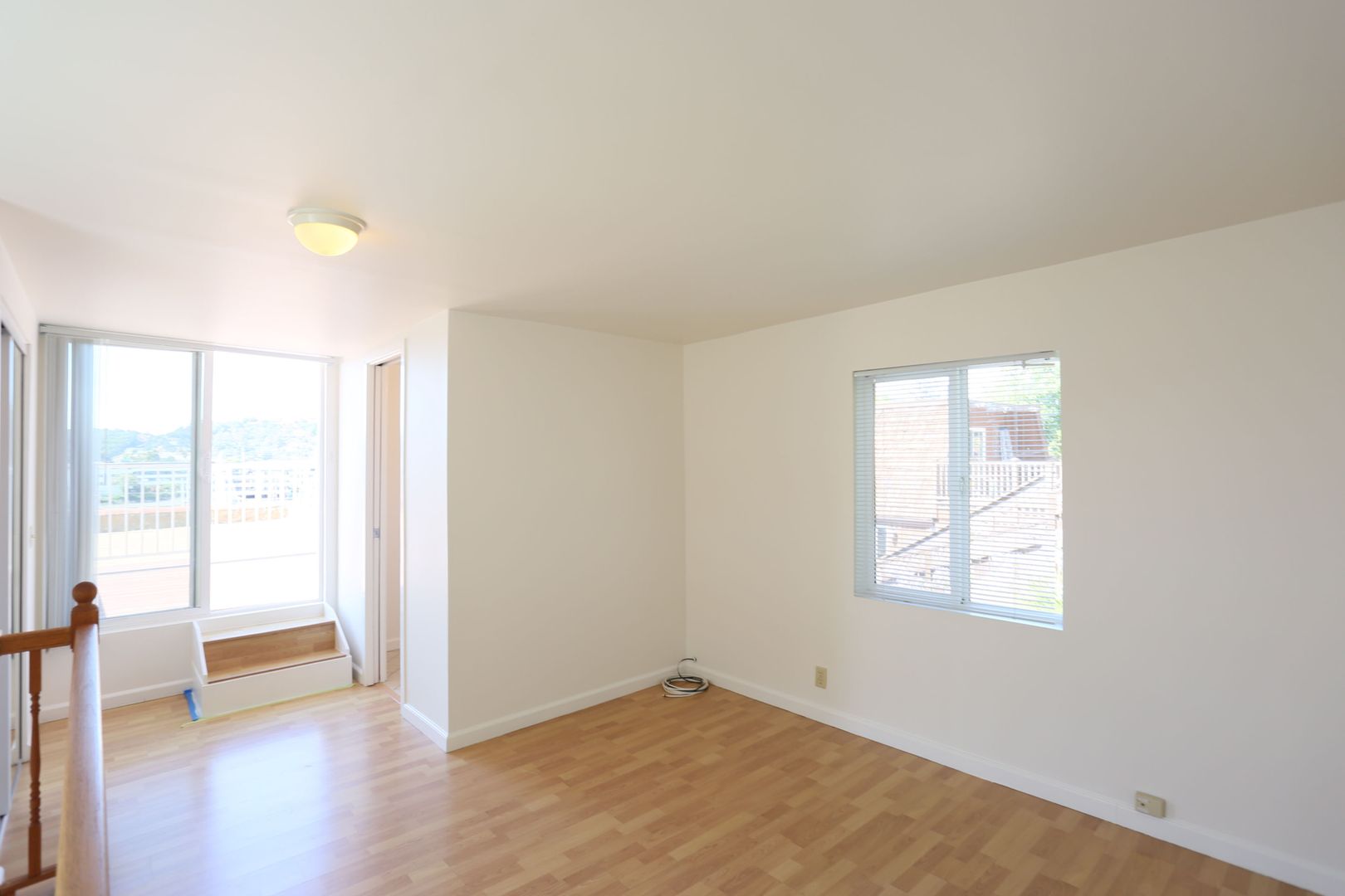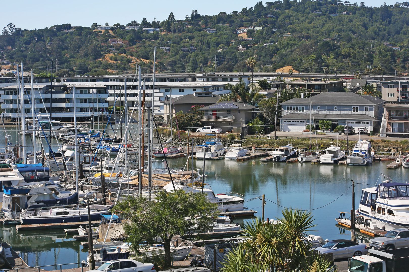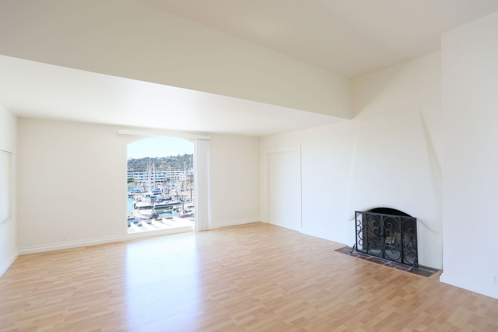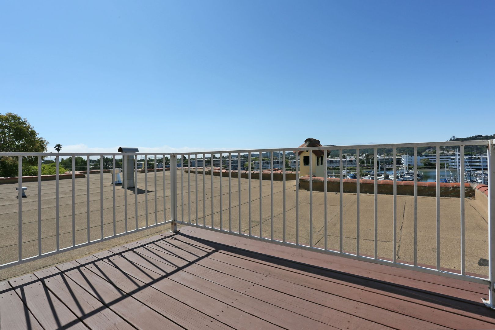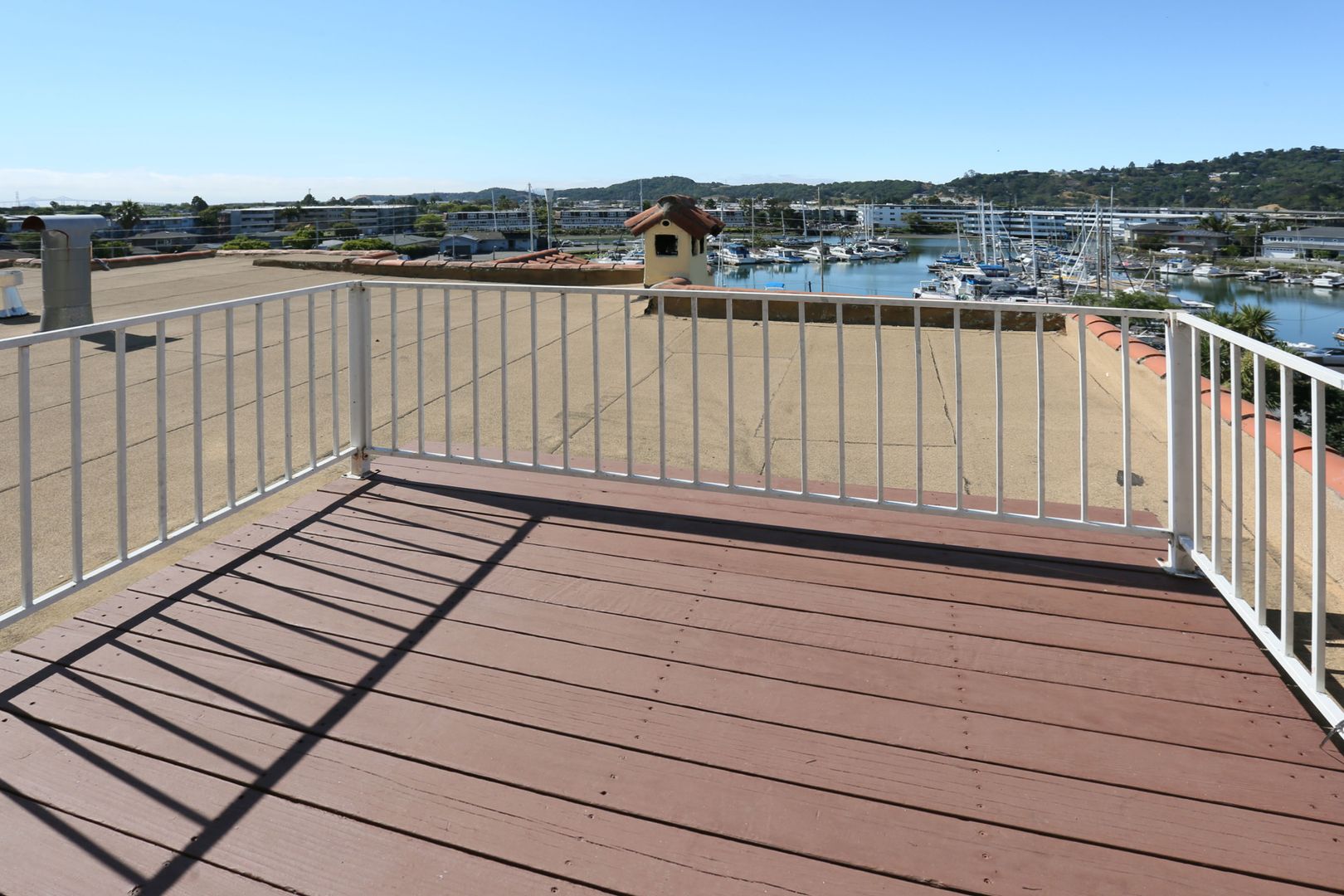 Gorgeous, top two floors 3BR/2.5BA facing San Rafael's Waterfront. The home is accessed via stairs from street level and has a secure door between the street and the unit itself. There is a porch between the stairs and the entrance to the apartment. Large living room has a wood-burning fireplace. It connects to the dining room and central hallway. It has a nice view of the marina across the street. Dining room provides access to the kitchen. Galley-style kitchen includes gas stove, microwave, dishwasher and lots of cabinet space. It has a pantry with shelves. Kitchen has sliding glass doors that open onto the yard. Terraced yard has a concrete-paved area. There are two bedrooms and two full baths on the main, lower floor. One bedroom has a large standard closet; the other has a wall closet with sliding mirror doors. Main bath is in the central hallway near the kitchen. It has shower-over-tub and his and hers sinks. The second bath has a glass shower stall. It is accessed through the second bedroom and is adjacent to the washer and dryer. A staircase leads up to the top floor from the laundry. The top floor is a bedroom with private deck and half bath. The deck is accessed via sliding glass doors and has a view of the marina and Mt. Tam.