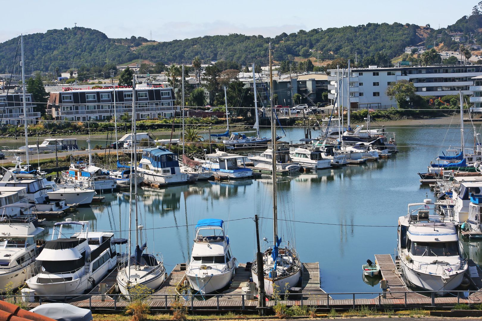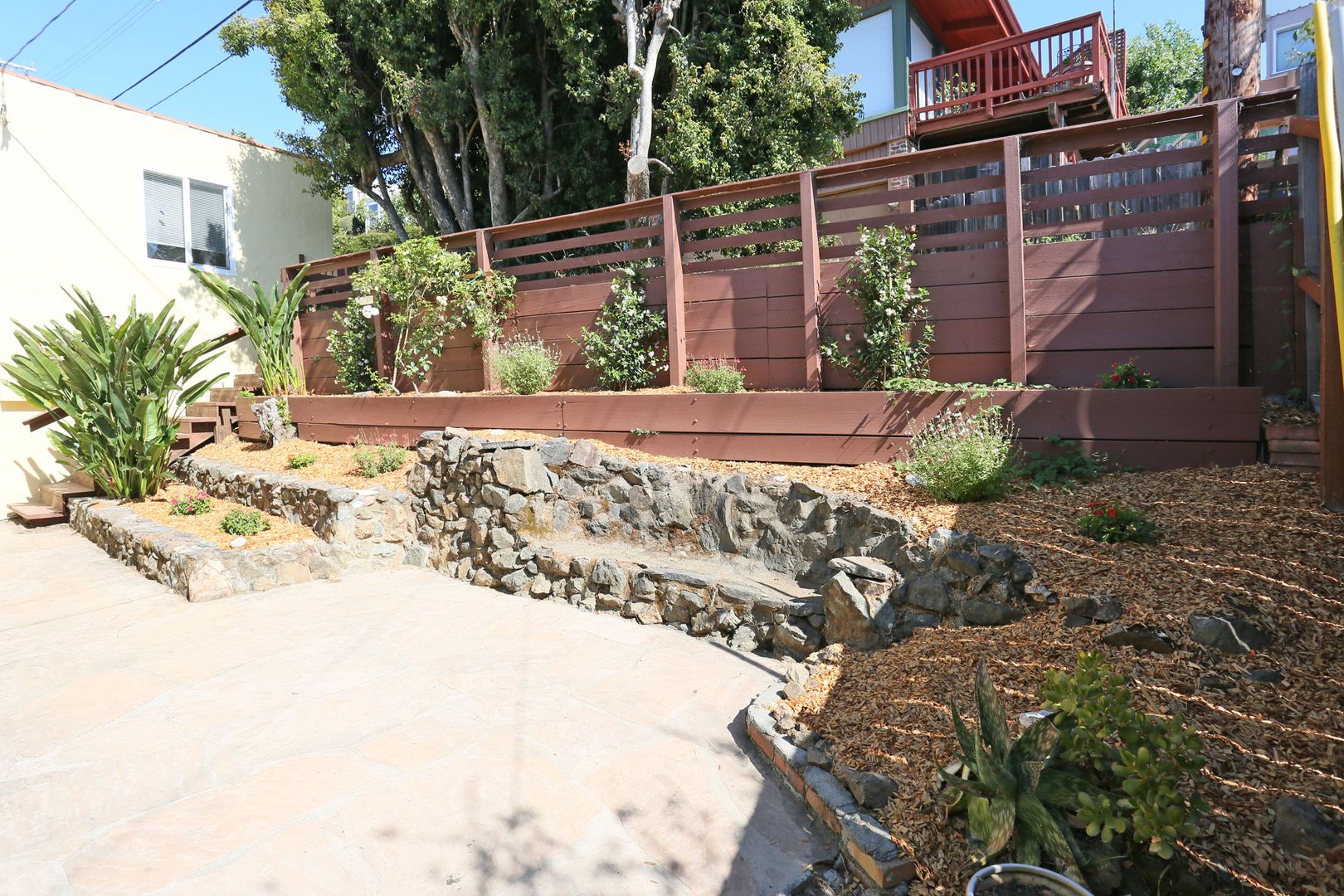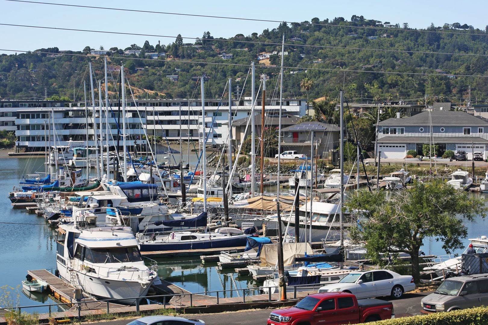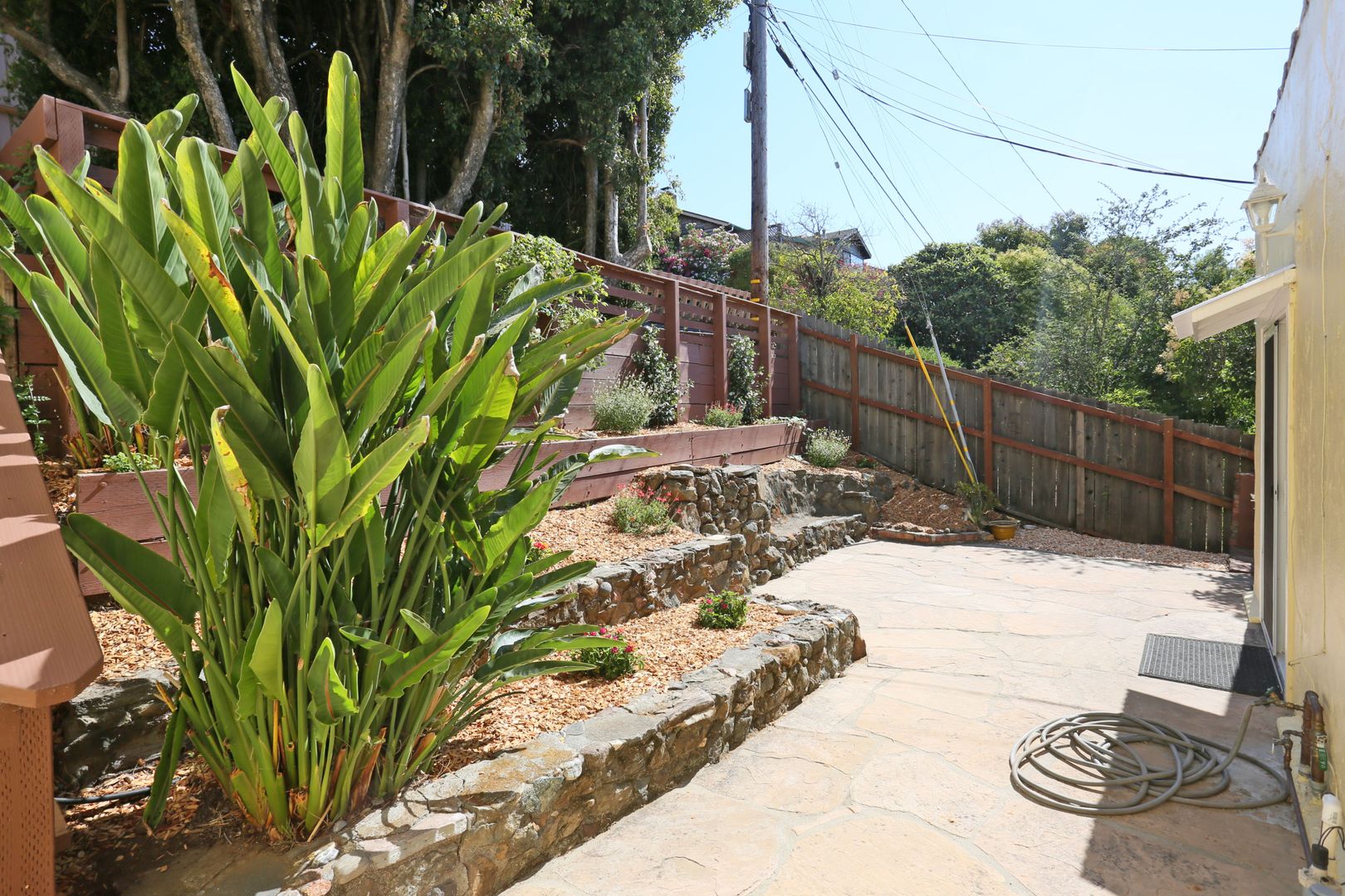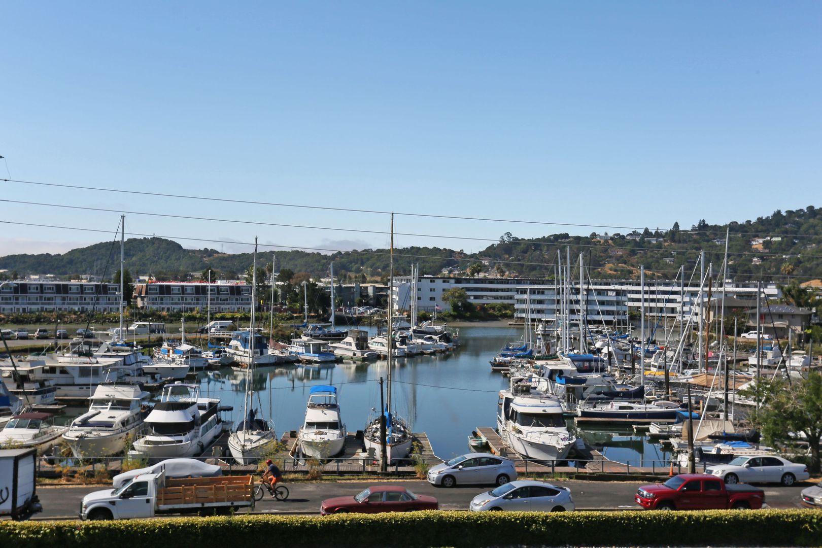 Gorgeous, top two floors 3BR/2.5BA facing San Rafael's Waterfront. The home is accessed via stairs from street level and has a secure door between the street and the unit itself. There is a porch between the stairs and the entrance to the apartment. Large living room has a wood-burning fireplace. It connects to the dining room and central hallway. It has a nice view of the marina across the street. Dining room provides access to the kitchen. Galley-style kitchen includes gas stove, microwave, dishwasher and lots of cabinet space. It has a pantry with shelves. Kitchen has sliding glass doors that open onto the yard. Terraced yard has a concrete-paved area. There are two bedrooms and two full baths on the main, lower floor. One bedroom has a large standard closet; the other has a wall closet with sliding mirror doors. Main bath is in the central hallway near the kitchen. It has shower-over-tub and his and hers sinks. The second bath has a glass shower stall. It is accessed through the second bedroom and is adjacent to the washer and dryer. A staircase leads up to the top floor from the laundry. The top floor is a bedroom with private deck and half bath. The deck is accessed via sliding glass doors and has a view of the marina and Mt. Tam.