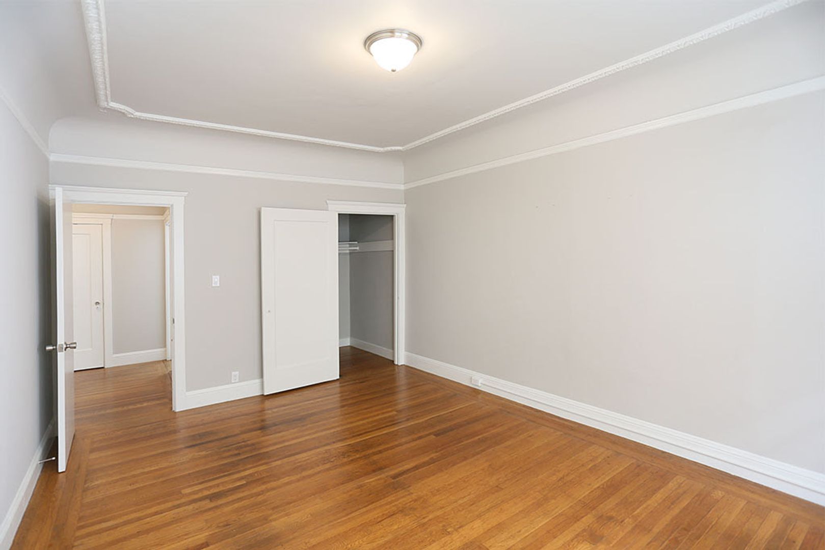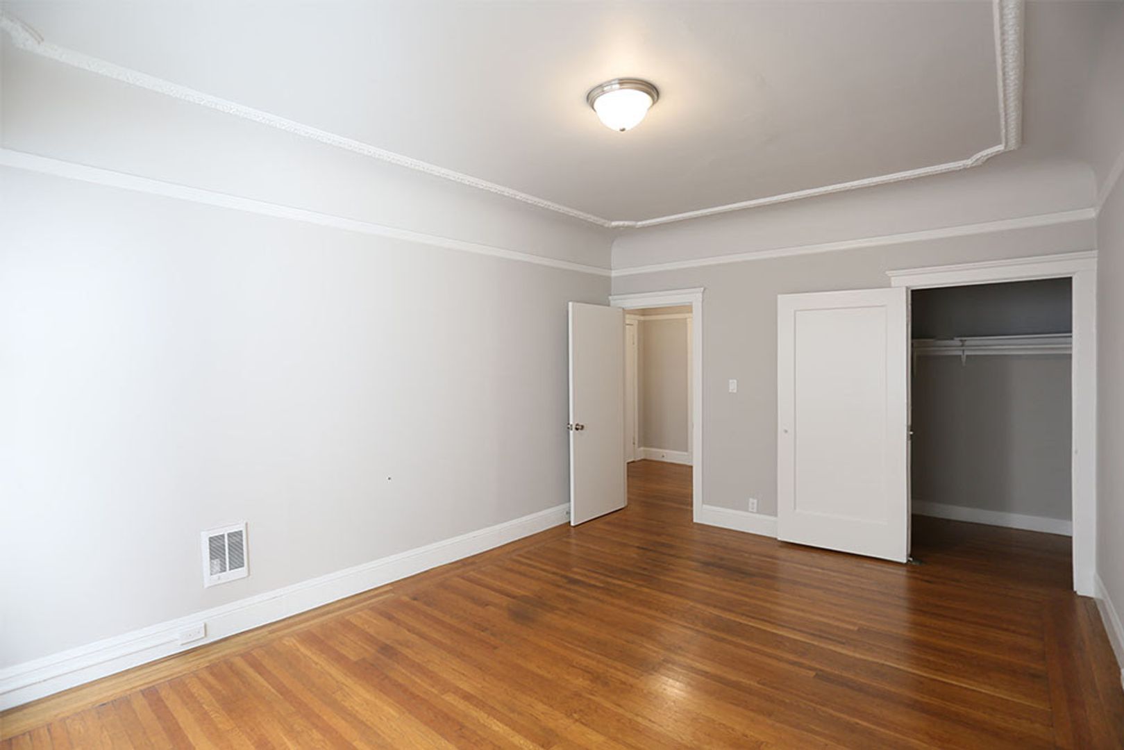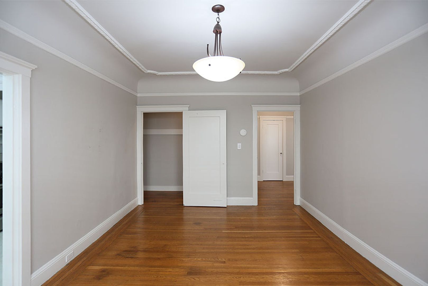 The spacious living room opens right to the galley‑style kitchen with a gas stove and a cozy nook by the window. Abundant closet space includes three large closets with huge walk‑through closets between the living room and bedroom, plus a generous walk‑in closet off the main hallway. The bathroom features a traditional tub with shower overhead.