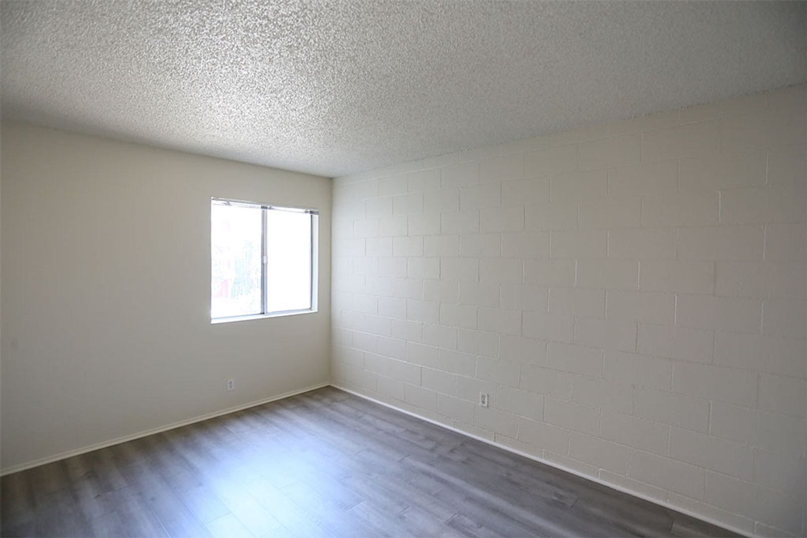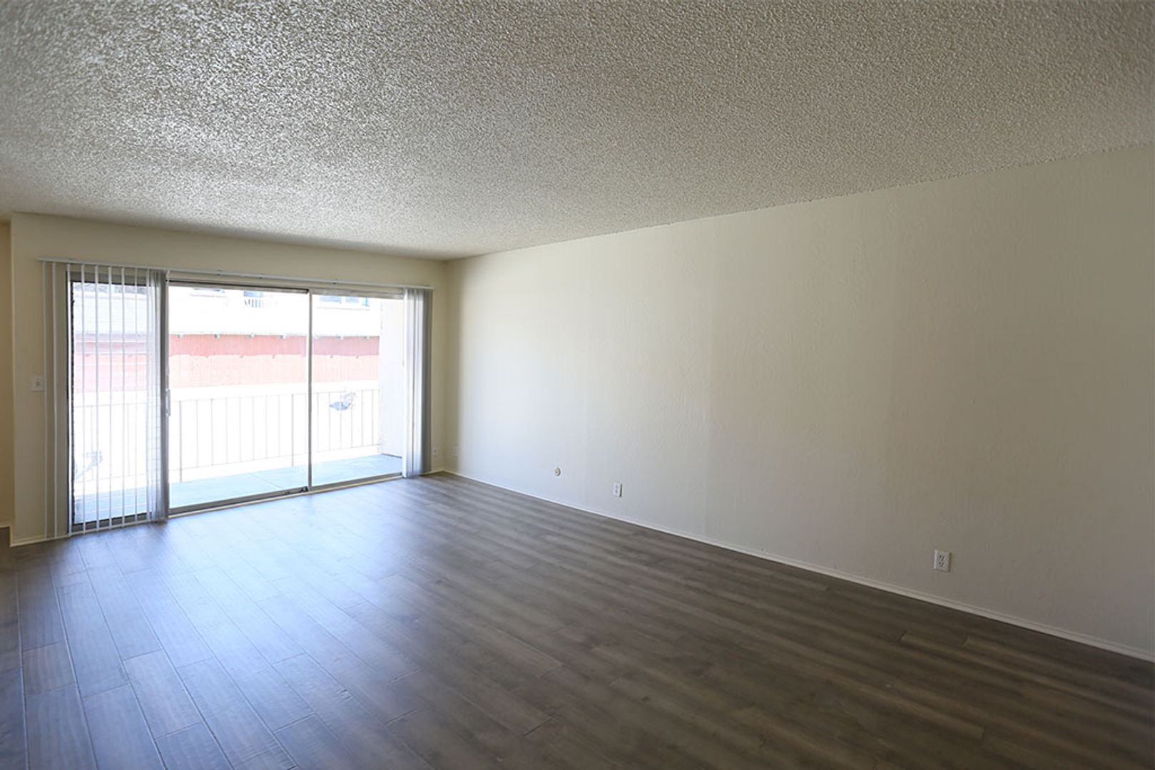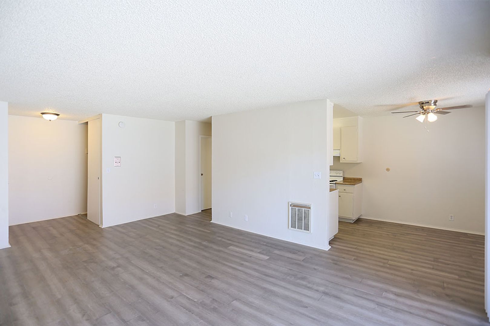 Contemporary second-floor 2BR/1BA in Oakland’s Civic Center neighborhood. Faux hardwood flooring runs throughout the home, with tile in the bathroom. A spacious, semi-open living room flows seamlessly to a private deck and connects to an open dining area with a ceiling fan. The galley-style kitchen features an electric stove and ample cabinet storage. Both bedrooms include walk-in closets, and the bathroom offers a shower-over-tub with sliding glass doors.