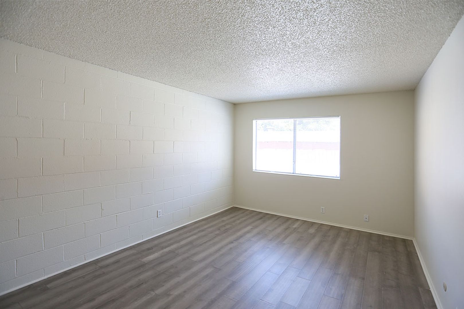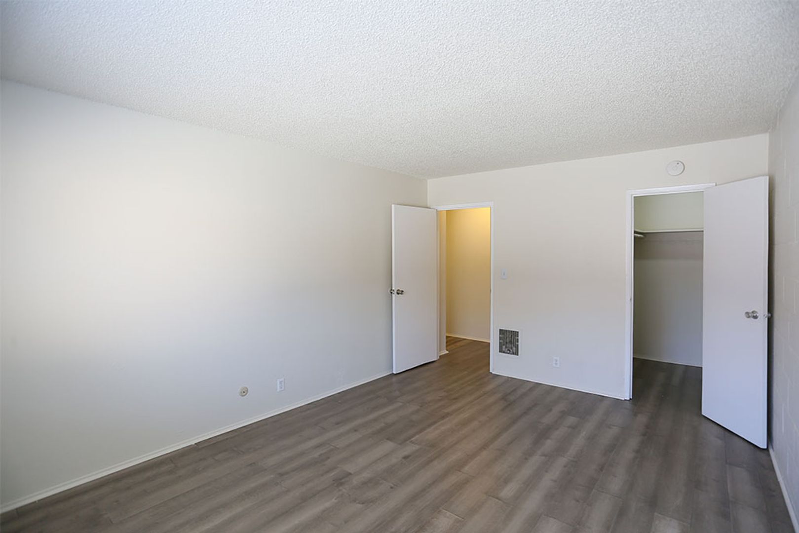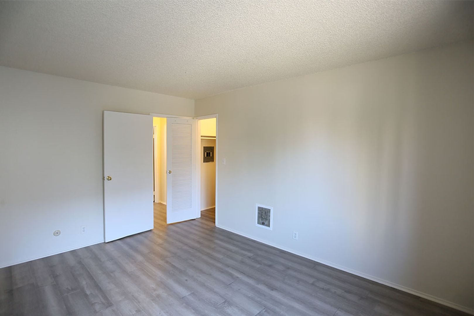 Contemporary second-floor 2BR/1BA in Oakland’s Civic Center neighborhood. Faux hardwood flooring runs throughout the home, with tile in the bathroom. A spacious, semi-open living room flows seamlessly to a private deck and connects to an open dining area with a ceiling fan. The galley-style kitchen features an electric stove and ample cabinet storage. Both bedrooms include walk-in closets, and the bathroom offers a shower-over-tub with sliding glass doors.