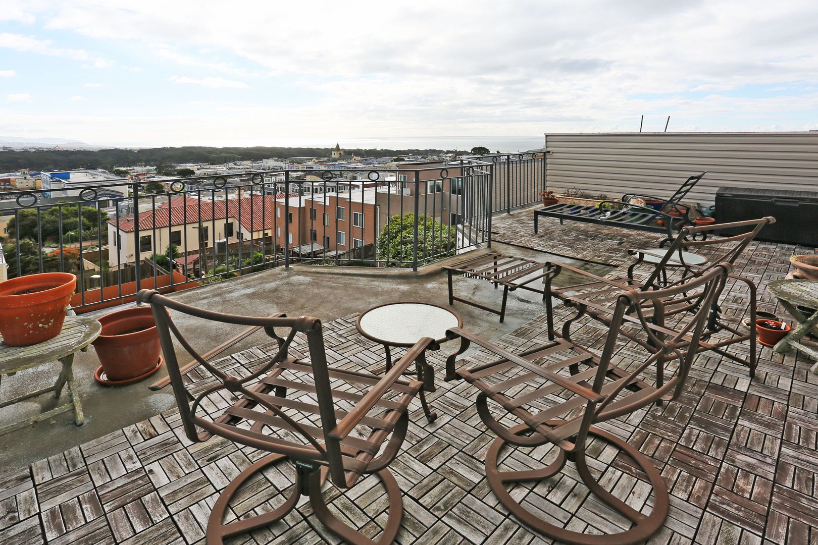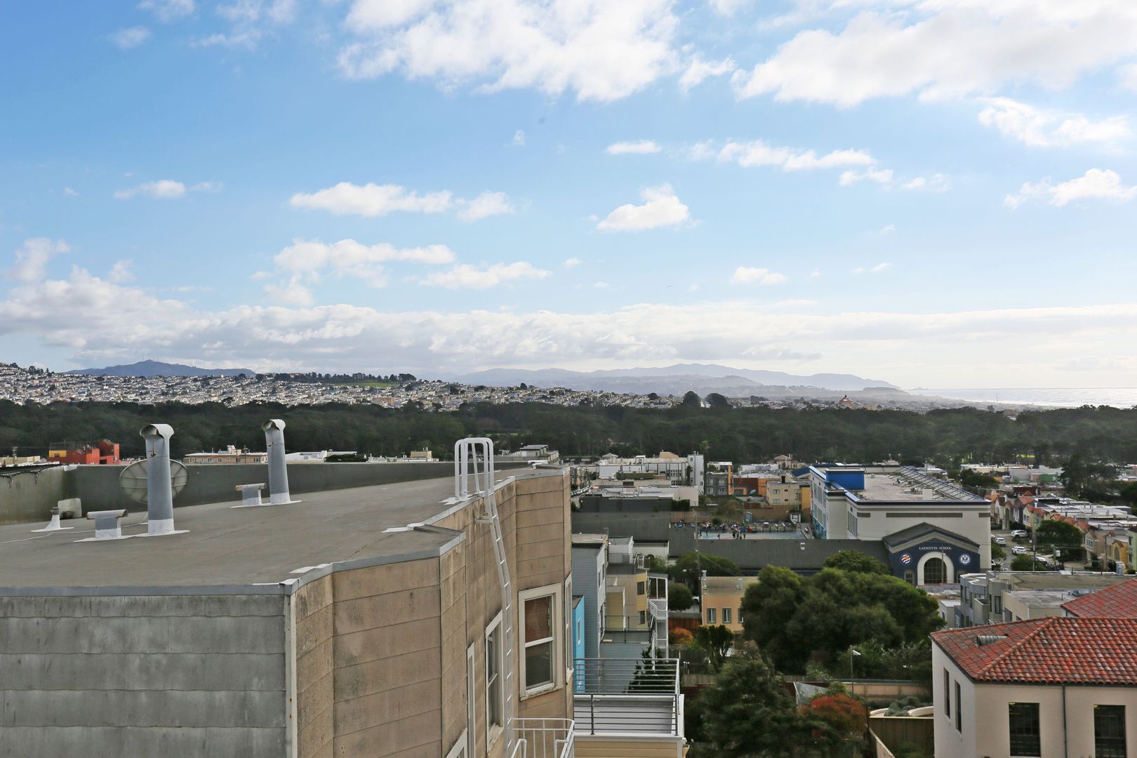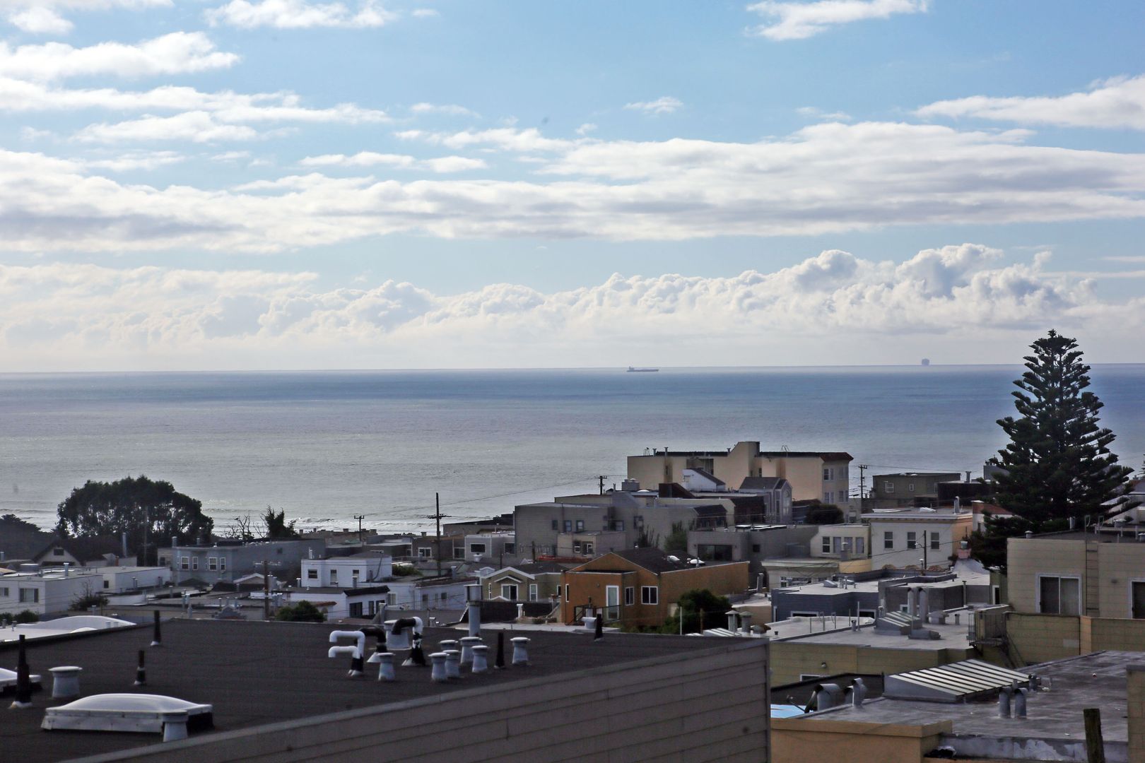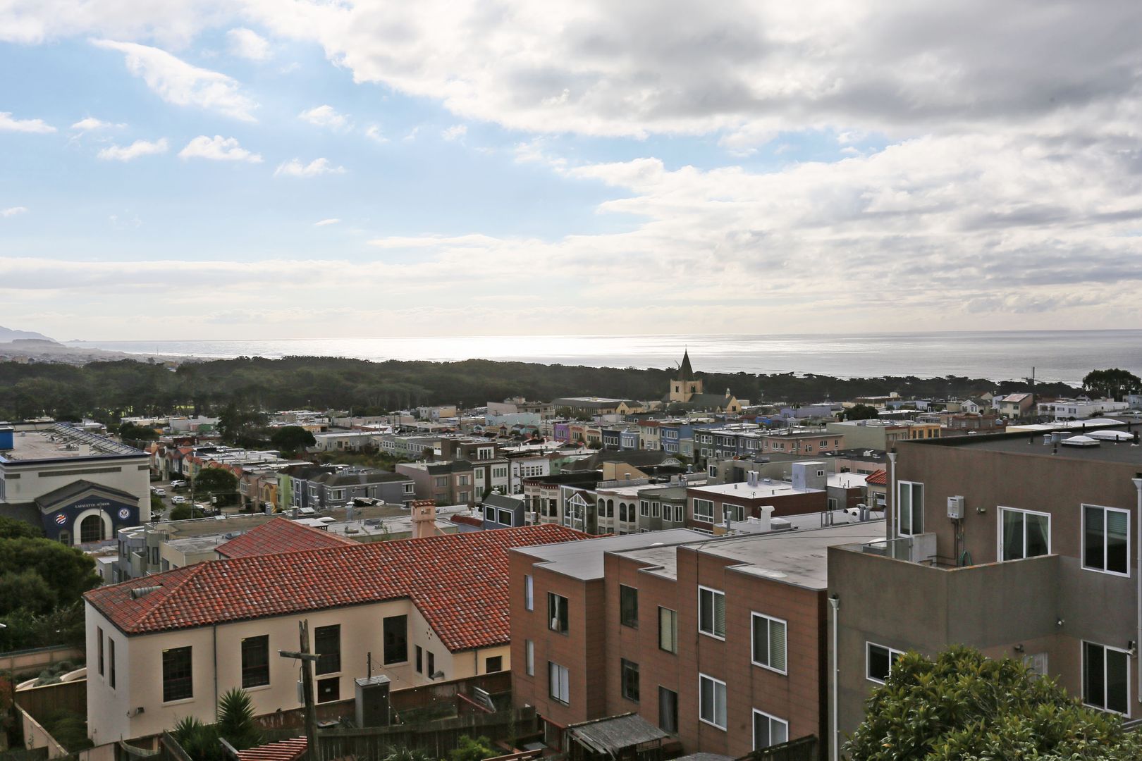 Top floor 3BR/2BA in the Outer Richmond. Floors are hardwood except in baths. Windows are double pane and heat is via forced air. Unit faces the front and back of the building. Open living room faces the eat-in kitchen on one side, with windows and sliding glass doors onto the deck to the southern back of the building. Incredible 180° panoramic view stretches from Mt. Sutro to Golden Gate Park and the south peninsula, and on to a broad expanse of the Pacific Ocean. Huge deck is partially parquet wood tile, partially concrete. Kitchen's all stainless appliances include refrigerator with water and ice dispenser, gas stove with hood, and dishwasher. Kitchen can accommodate a dining arrangement for four. Master bedroom faces the front of the building. It has bay windows and a short hallway with sliding mirror doors on both sides, which in turn connects to the bath. Bath has a skylight and shower stall with sliding glass doors. Second bedroom also faces the front of the building. It has a wall closet with sliding mirror doors. Third bedroom is mid-unit. It also has a wall closet with sliding mirror doors. Shared bath has a skylight and shower-over-bath with sliding glass doors. There is a large linen closet adjacent to the bath and a deep storage closet in the central hallway.