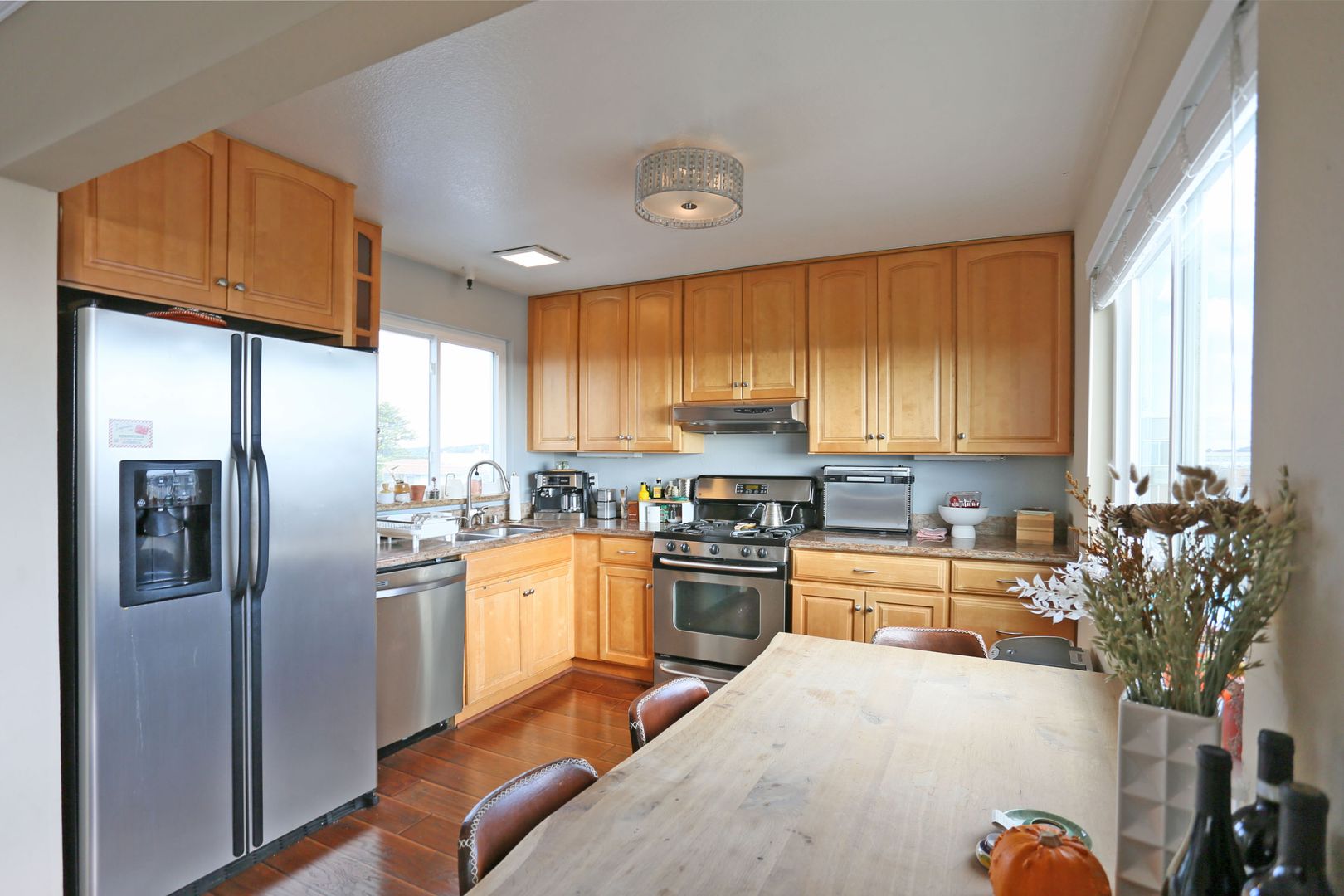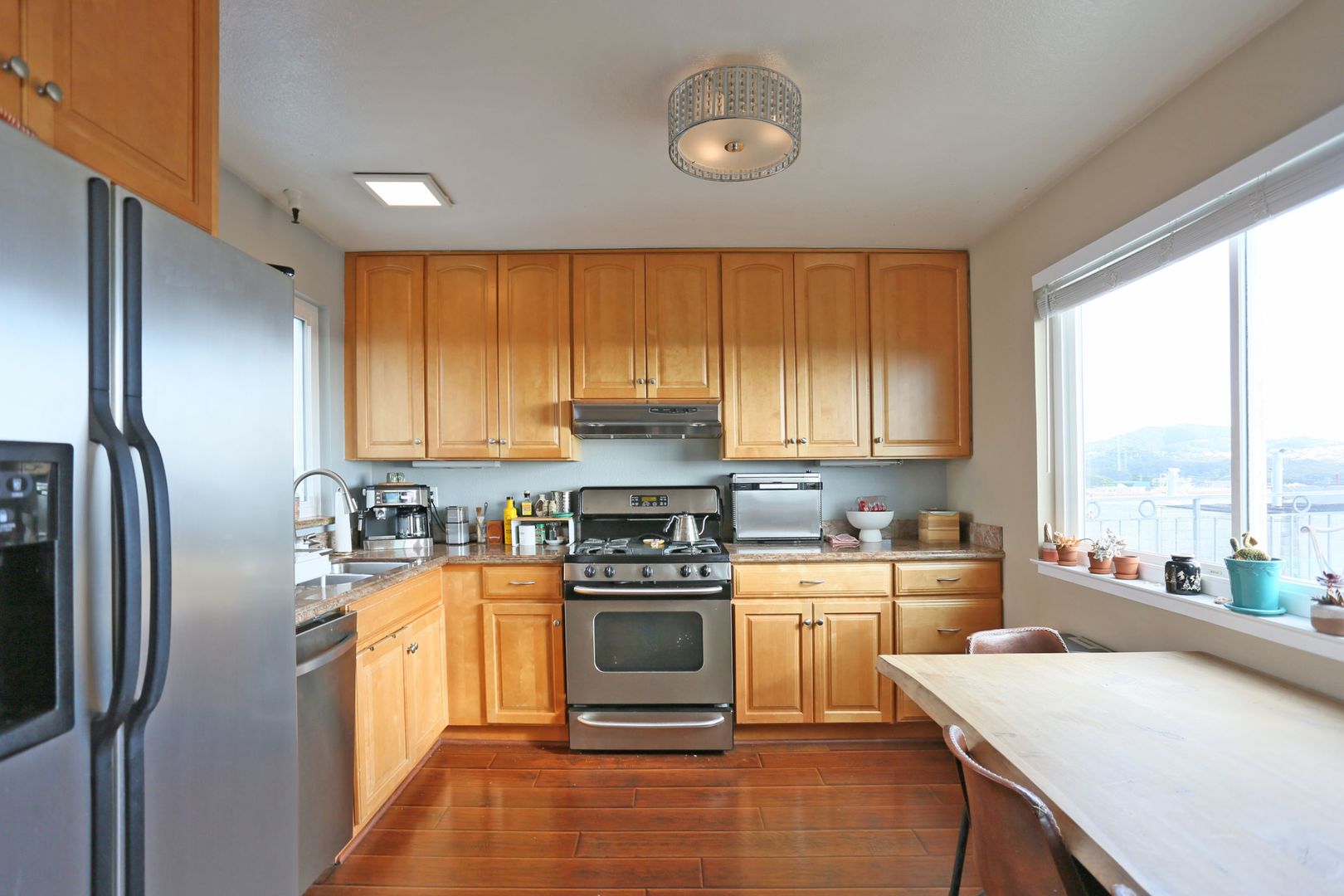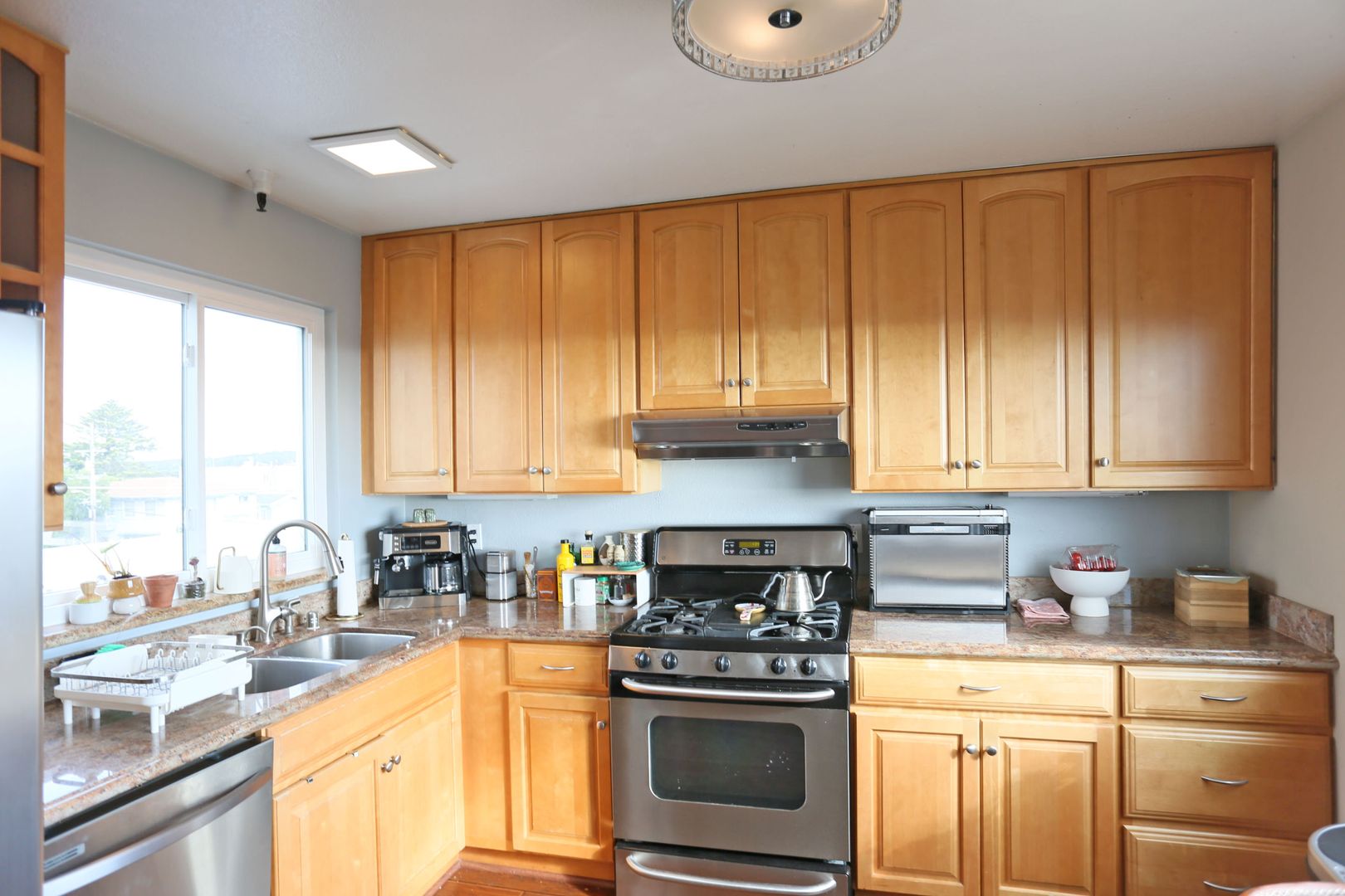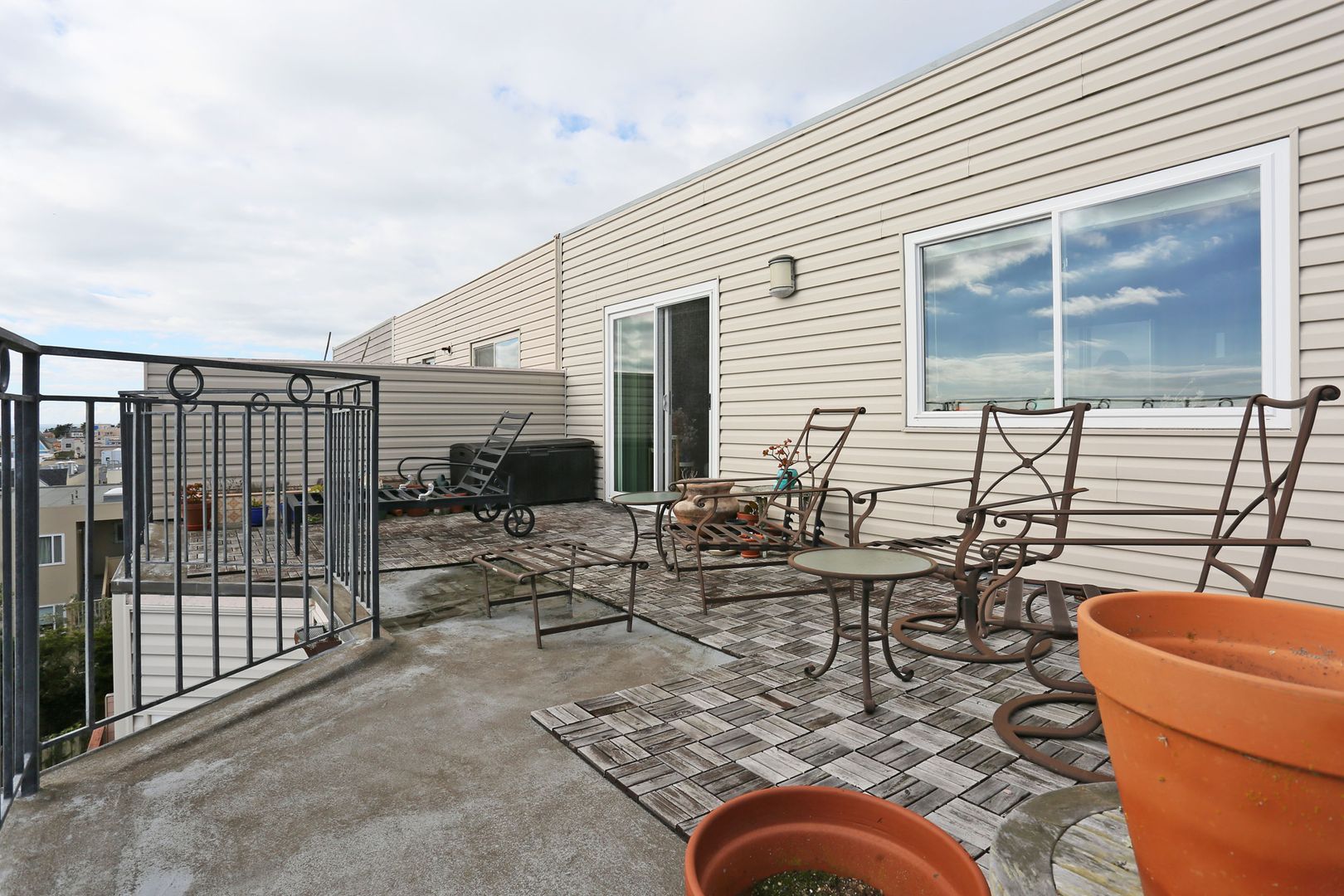 Top floor 3BR/2BA in the Outer Richmond. Floors are hardwood except in baths. Windows are double pane and heat is via forced air. Unit faces the front and back of the building. Open living room faces the eat-in kitchen on one side, with windows and sliding glass doors onto the deck to the southern back of the building. Incredible 180° panoramic view stretches from Mt. Sutro to Golden Gate Park and the south peninsula, and on to a broad expanse of the Pacific Ocean. Huge deck is partially parquet wood tile, partially concrete. Kitchen's all stainless appliances include refrigerator with water and ice dispenser, gas stove with hood, and dishwasher. Kitchen can accommodate a dining arrangement for four. Master bedroom faces the front of the building. It has bay windows and a short hallway with sliding mirror doors on both sides, which in turn connects to the bath. Bath has a skylight and shower stall with sliding glass doors. Second bedroom also faces the front of the building. It has a wall closet with sliding mirror doors. Third bedroom is mid-unit. It also has a wall closet with sliding mirror doors. Shared bath has a skylight and shower-over-bath with sliding glass doors. There is a large linen closet adjacent to the bath and a deep storage closet in the central hallway.