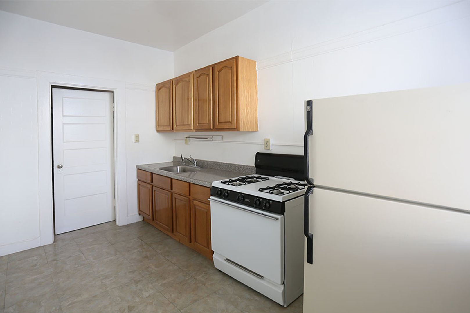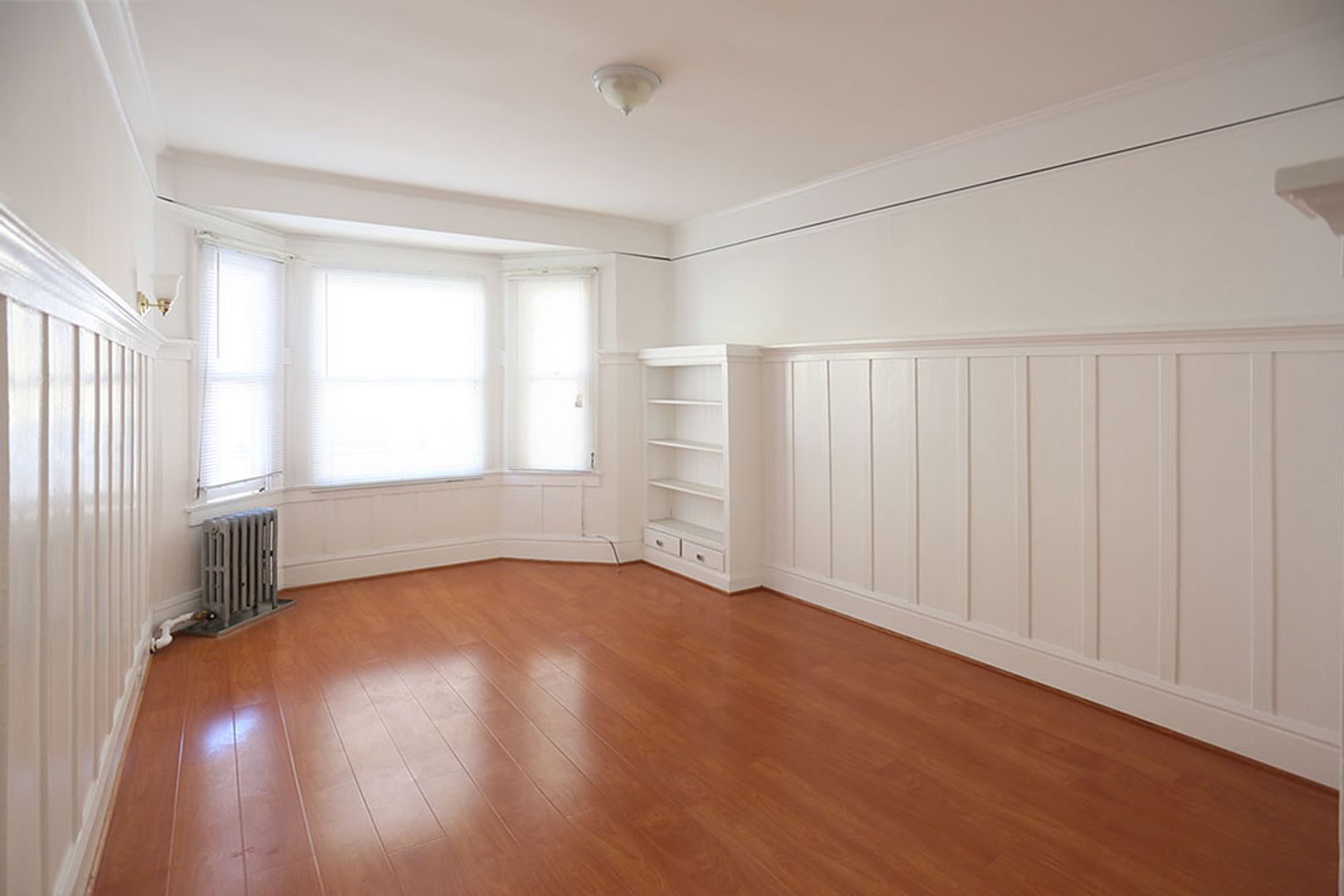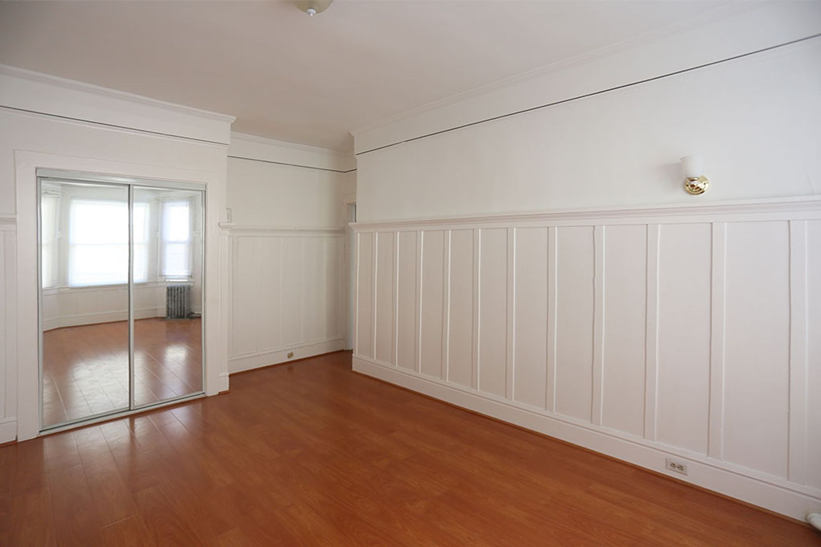 Downtown district third floor Jr 1BR/1BA on Bush at Mason. Bright studio's main room has hardwood floor, deep closet with sliding mirror doors, and built-in shelving. Heat is steam. Kitchen includes gas stove, has linoleum floor and room for a modest dining arrangement. Bath is standard with shower-over-tub. There is a very large hall closet.
