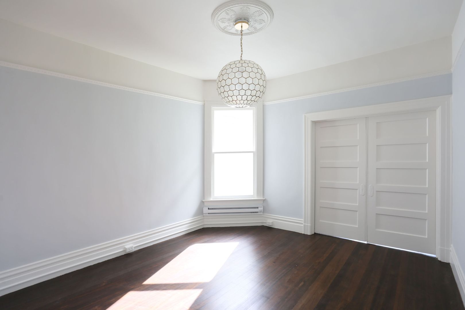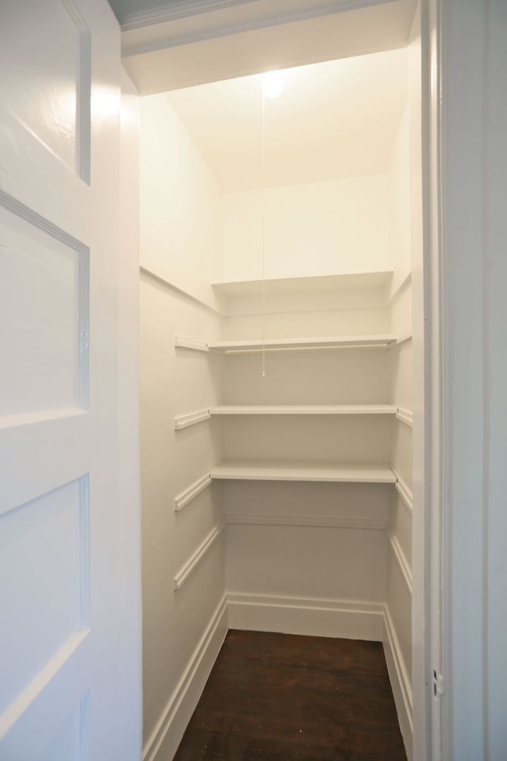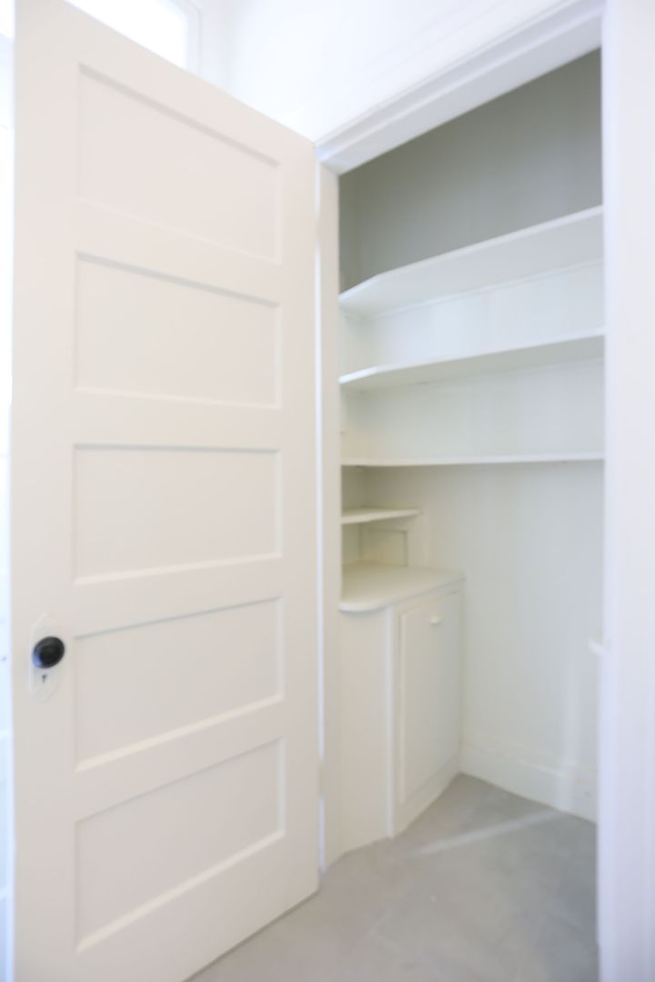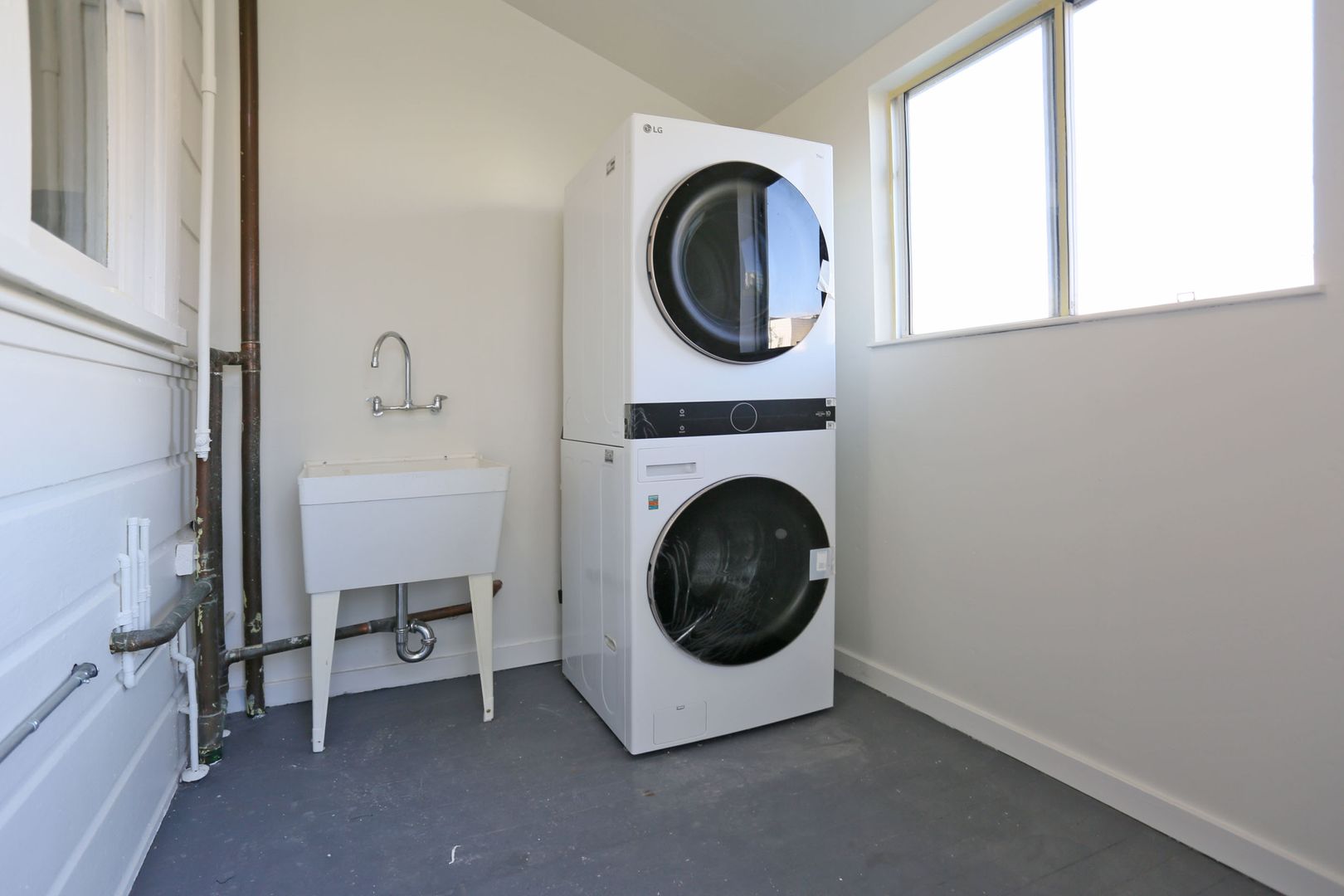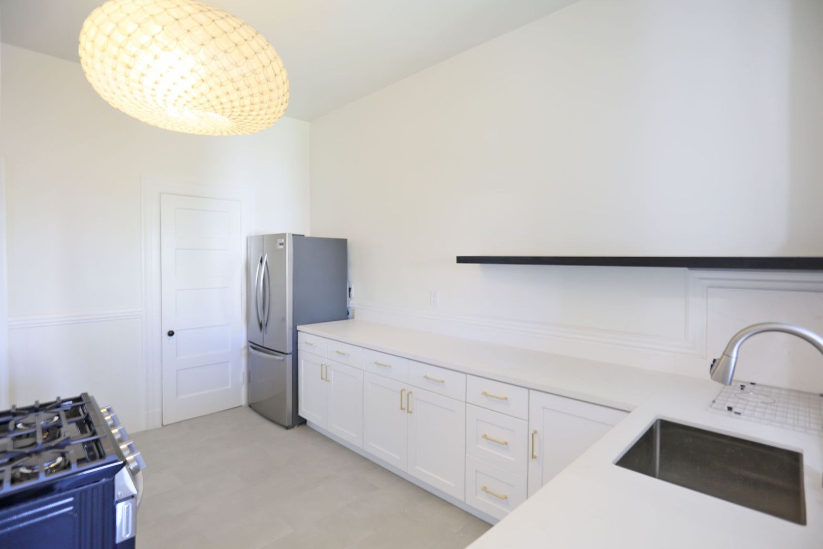 The living room faces the street and features bay windows, two upright cabinets, and an ornamental fireplace. The spacious kitchen is located toward the back of the flat and includes a gas stove, dishwasher, and two pantries. A large laundry room sits at the rear of the unit and is equipped with a stacked front-loading washer and dryer, along with a laundry sink.