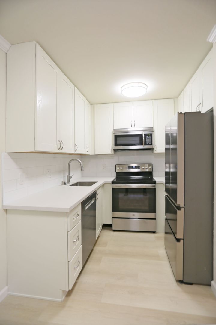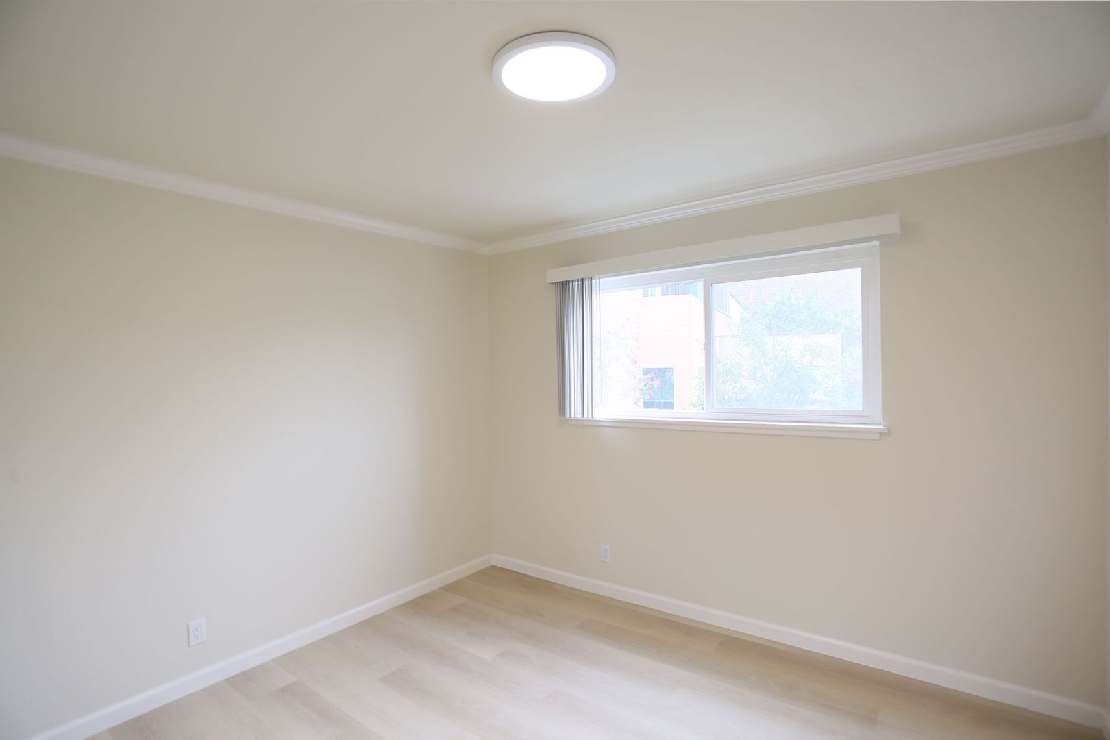 Contemporary 2BR/1BA. Floors are hardwood except in bath. Open living room has kitchen inset to one side with a space for a dining arrangement at its front. Kitchen's all stainless appliances include electric stove, dishwasher and microwave. Both bedrooms have closets with sliding mirror doors. One of the bedrooms provides access to the deck. Bath has shower-over-tub with sliding glass doors.